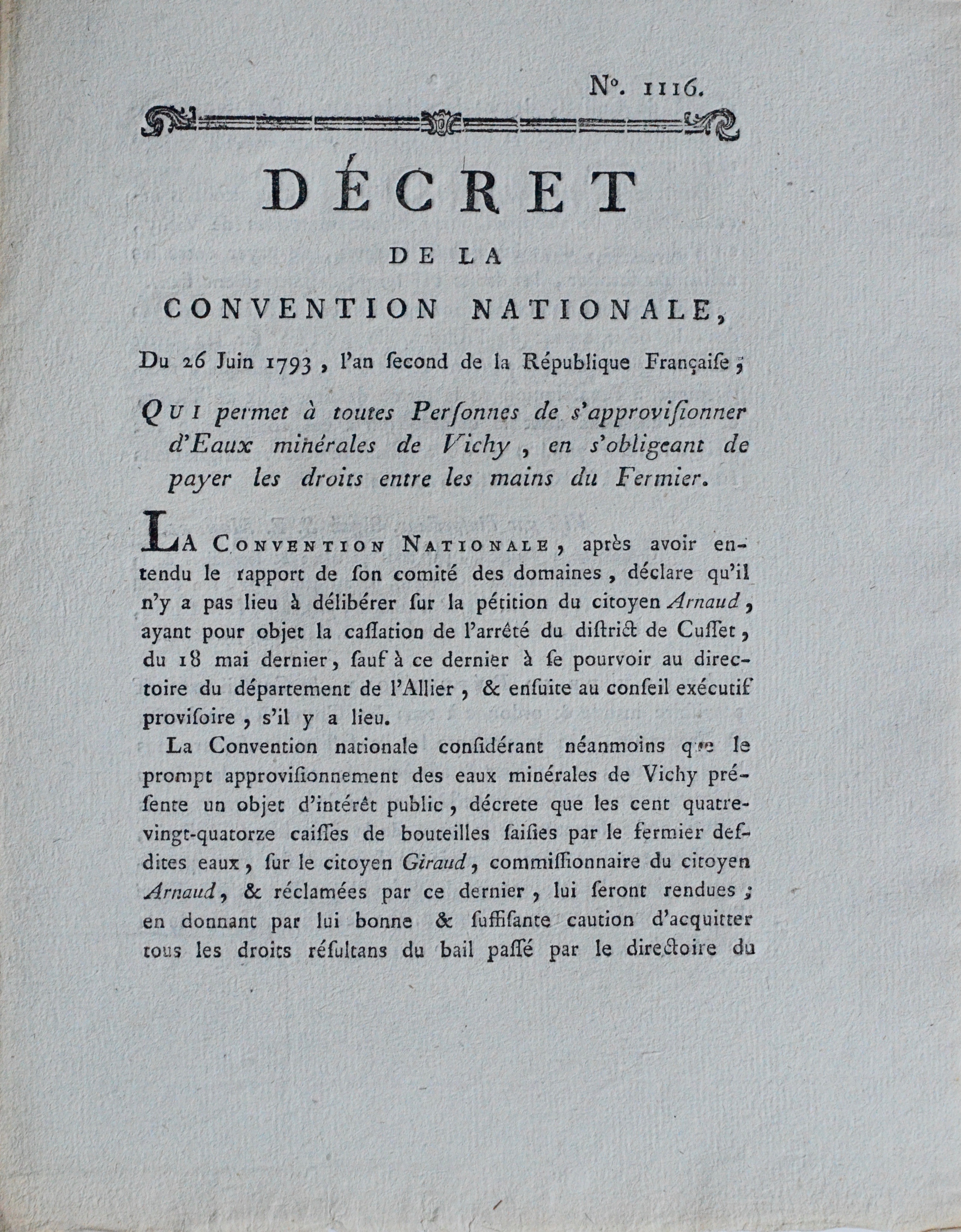 Suite à la pétition du Citoyen Arnaud "ayant pour objet la cassation de l'arrêté du district de Cusset, du 18 mai dernier [...], la Convention nationale, considérant néanmoins que le prompt approvisionnement des eaux minérales de Vichy, présente un objet d'intérêt public, décrète que les cent quatre-vingt-quatorze caisses de bouteilles saisies par le fermier desdites eaux, sur le citoyen Giraud, commissionnaire du citoyen Arnaud, et réclamées par ce dernier, lui seront rendues en donnant par lui bonne et suffisante caution d'acquitter tous les droits résultant du bail passé par le directoire du district de Cusset , devant lequel la caution sera reçue contradictoirement avec le même fermier et le préposé de la régie nationale [...]".