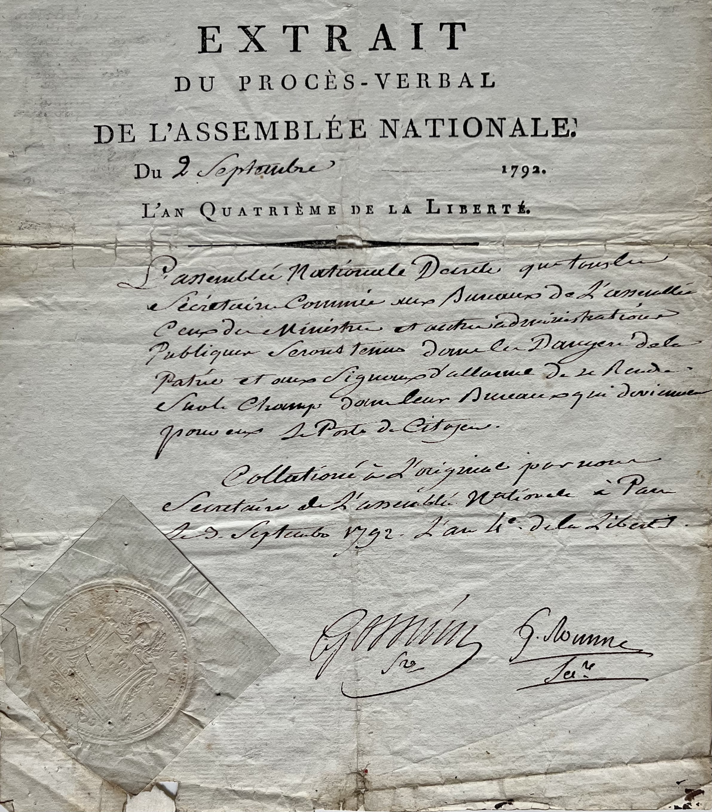 Pièce signée par le conventionnel montagnard Gilbert Romme, signée également par Constant-Joseph-Etienne Gossuin. En-tête des Extrait du procès-verbal de l'Assemblée nationale (manque la vignette). Sceau sous papier.