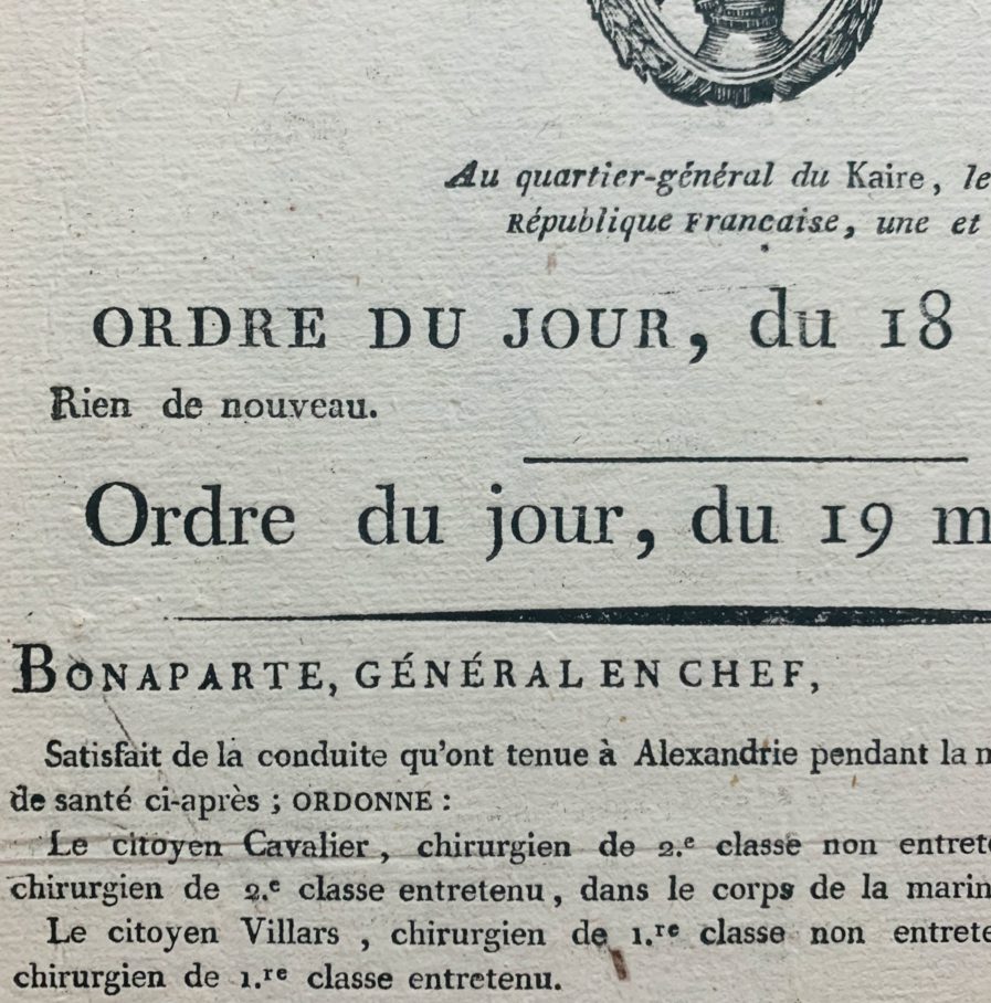 Par cet ordre, Bonaparte promeut un certain nombre d'officiers de santé qui se sont distingués lors de la maladie contagieuse qui a sévit à Alexandrie (Villars, Destiennes, Cavalier, Bonino, Salz, Claris, Carico et Maubon).