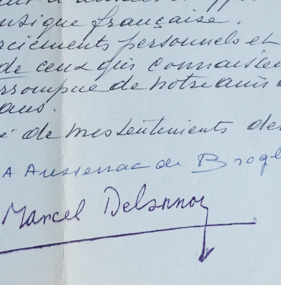 Lettre signée du compositeur Marcel Delannoy (griffe), co-signée par la pianiste Marie-Antoinette Aussenac de Broglie et adressée à Henri Martelli.