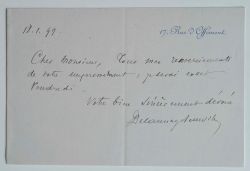 Dans ce billet, l'industriel Louis-Marie Delaunay-Belleville confirme son rendez-vous avec l'économiste Alfred de Foville : «Je serai exact vendredi».