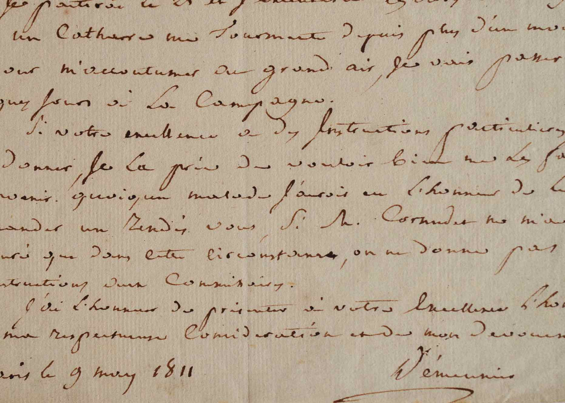 Le Comte de l'Empire Jean-Nicolas Démeunier vient d'apprendre sa nomination à la Cour Impériale de Toulouse par Napoléon : « Je partirai le 21 et j'exécuterai les ordres de Sa Majesté. [...] Si Votre Excellence a des instructions particulières à me donner, je la prie de bien vouloir me les faire parvenir. » Toutefois, on lui a dit « que dans cette circonstance, on ne donne pas d'instructions aux Commissaires. »