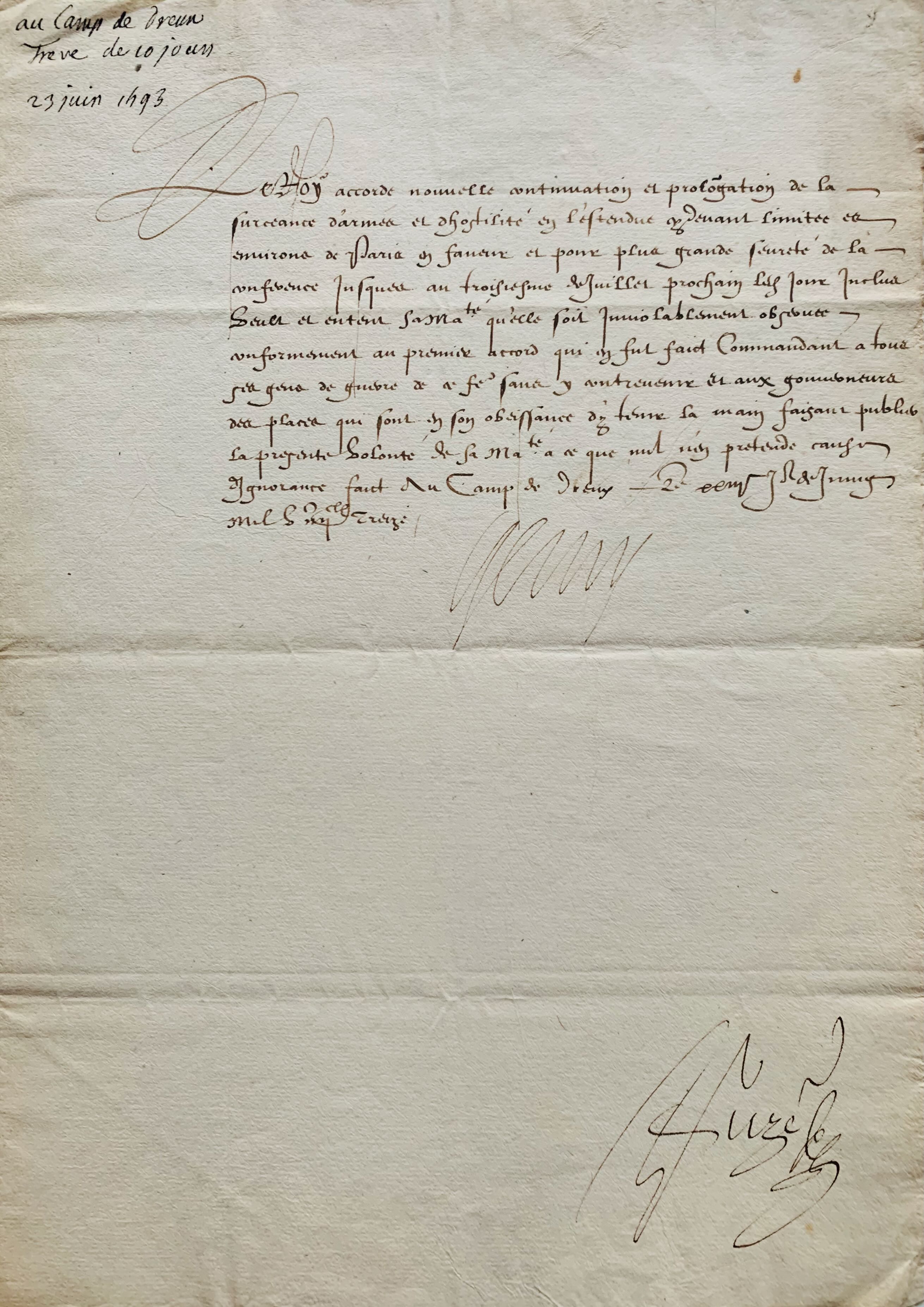Henri IV (Pau, 1553/1610)Un mois avant son abjuration, alors qu'il dirige le siège de Dreux, Henri IV signe une nouvelle trêve de dix jours.