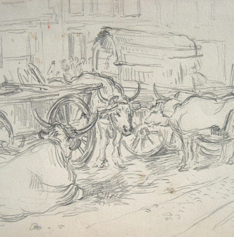 Dessin anonyme à la mine de plomb, représentant des attelages de boeufs dans une rue de Pau.