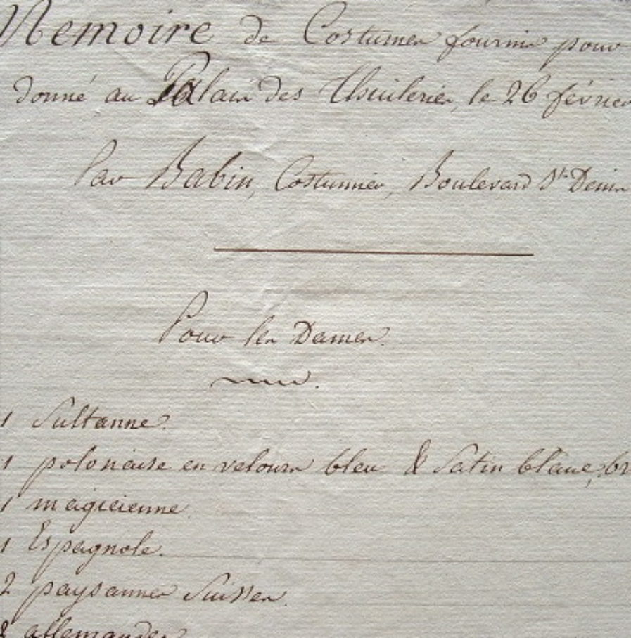 Mémoire manuscrit intitulé : "Mémoire de costumes fournis pour le bal donné au Palais des Thuileries le 26 février 1811 par Babin, costumier, boulevard Saint-Denis, n°5". Détail des costumes pour un bal maqué : 2 Espagnols en velours brodés d'or, 2 Sultans, 4 mameluks en velours, 2 pages en satin blanc, brodé à lame, des Pierrots, Arlequins et Polichinel ou encore, 6 costumes de Molière ; avec les accessoires : 9 douzaines de masques à dominos en satin de différentes couleurs pour dames, à 36 f. la douzaine, 324 [...] 4 douzaines de gands amadis pour dames à 18 f. 72, etc. Babin note également les accessoires perdus.