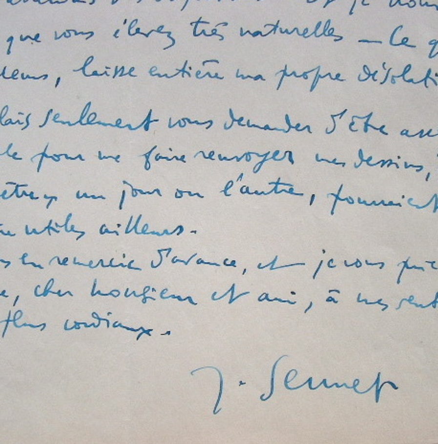 Sennep s'excuse de répondre tardivement à sa lettre «si aimable et si désespérée». «Mais je vous l'avais dit : je vous remettais ces dessins comme projet - comme essai. C'est donc que j'attendais des objections. Et je trouve celles que vous élevez très naturelles - ce qui d'ailleurs, laisse entière ma propre désolation !». Il lui demande le renvoi de ses dessins : qui «peut-être, un jour ou l'autre, pourraient m'être utiles ailleurs».