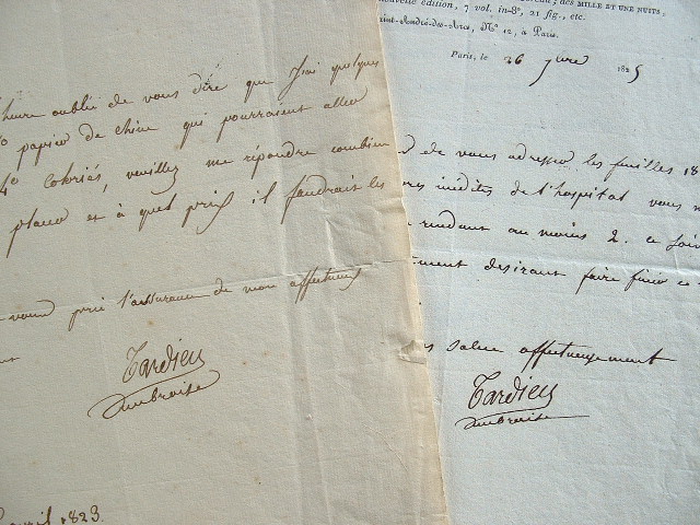«J'ai tout à l'heure oublié de vous dire que j'ai quelques exemplaires in 4° coloriés, veuillez me répondre combien on pourrait en placer et à quel prix il faudrait les mettre». Il lui parle ensuite de l'édition des Oeuvres inédites de Michel de l'Hospital pour lesquelles il adresse les feuilles 18 à 21 [Oeuvres complètes illustrées et publiées par ses soins en 4 vol., 1824-1825]. "Vous m'obligerez beaucoup en m'en rendant au moins 2 ce soir, et les autres promptement, désirant faire finir ce volume le plus vite possible». La dernière est relative à l'épreuve de 2 planches.