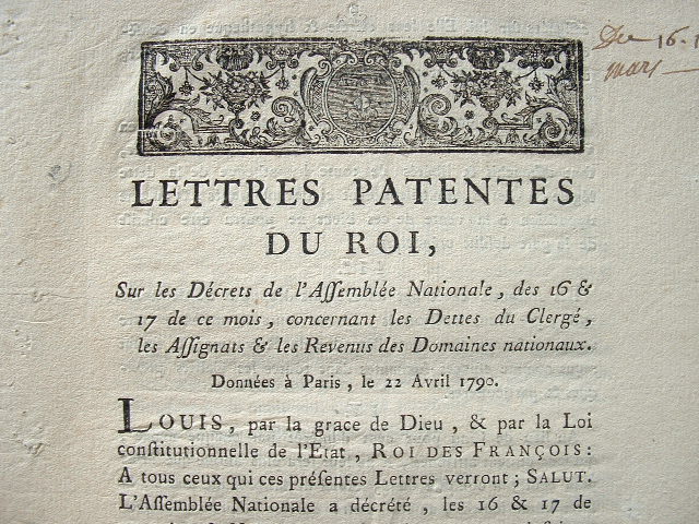 «Lettres patentes du roi sur les décrets de l'Assemblée nationale des 16 et 17 de ce mois, concernant les dettes du clergé, les assignats et les revenus des domaines nationaux, données à Paris le 22 avril 1790». «Décret de la Convention nationale du 8 mars 1793 relatif aux billets de confiance et de secours». «Décret de la Convention nationale du 1er août 1793 portant des peines contre ceux qui refuseroient des assignats-monnoie ou les donneroient ou recevroient à une perte quelconque».