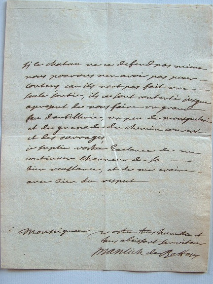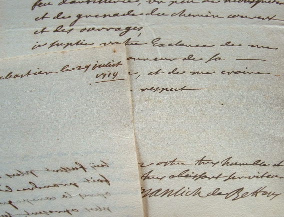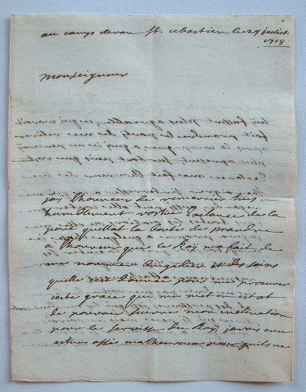 Georges Mannlich de Bettens (Marrens, 1669/1751)Mannlich de Bettens vient d'être promu brigadier des armées du roi. Il donne des nouvelles du siège de Saint-Sébastien où les troupes du maréchal de Berwick ont pris position. «Le 25 au matin, nos bateries de 20 pièces de canon et de 12 mortiers qui sont au delà de la rivière à la droite de nostre attaque commencèrent à tirer ; la nuit du mesme jour que j'avois l'honneur d'estre de tranchée avec S. alt. monseign. le Prince de Conty, les travaux furent poussés du mesme costé jusque à la mer par deux lignes parallèles qui feront le débouché pour monter à l'assau par la brèche que nos batteries font à la ville en laissant là tous les ouvrages avancés. On coulera tout le long de la mer à marée basse seulement pour se rendre au pié de la bèche, sans avoir à craindre ce flan de l'ouvrage à corne. Les défenses seront ruinées par une baterie de six pièces de canon qui est vis à vis au deçà de la rivière et qui commencera à tirer aujourd'hui. La nuit du 26 au 27, on poussa deux crochets en avant [...]». Il explique comment ils ont été disposés. «Les ennemis abandonnèrent cette partie droite du chemin couvert où nous sommes logés, tout cela se fait fort heureusement sans beaucoup de pertes. Depuis deux jours, les assiégés retirent du canon de la ville au château, ce qui fait croire qu'ils pourront bien l'abandonner, sans quoi il y a apparence que au 2 aoust au plus tost, nous pourrons leur donner l'assaut. Si le château ne se défend pas mieux, nous pourrons n'en avoir pas pour contens car ils n'ont pas fait une seule sortie ; ils se sont contentés jusque à présent de nous faire un grand feu d'artillerie, un peu de mousqueterie et de grenade du chemin couvert et des ouvrages [...]». [La citadelle sera prise le 17 août].
