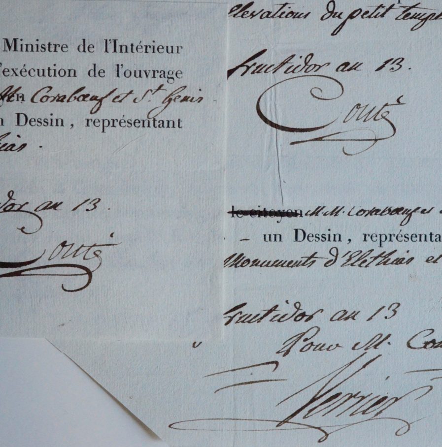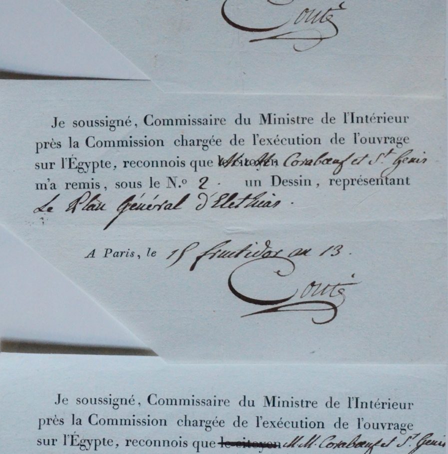 "Je soussigné, Commissaire du Ministre de l'Intérieur près la Commission chargée de l'exécution de l'ouvrage sur l'Égypte, reconnois que MM. Coraboeuf et St Genis m'a remis, sous le n°1, un dessin représentant les plan, coupes et élévations du petit temple d'Elethias". Puis sous le n°2 "le Plan général d'Elethias" et sous le n°3 "le plan particulier des monuments d'Elethias et de Tuphium".