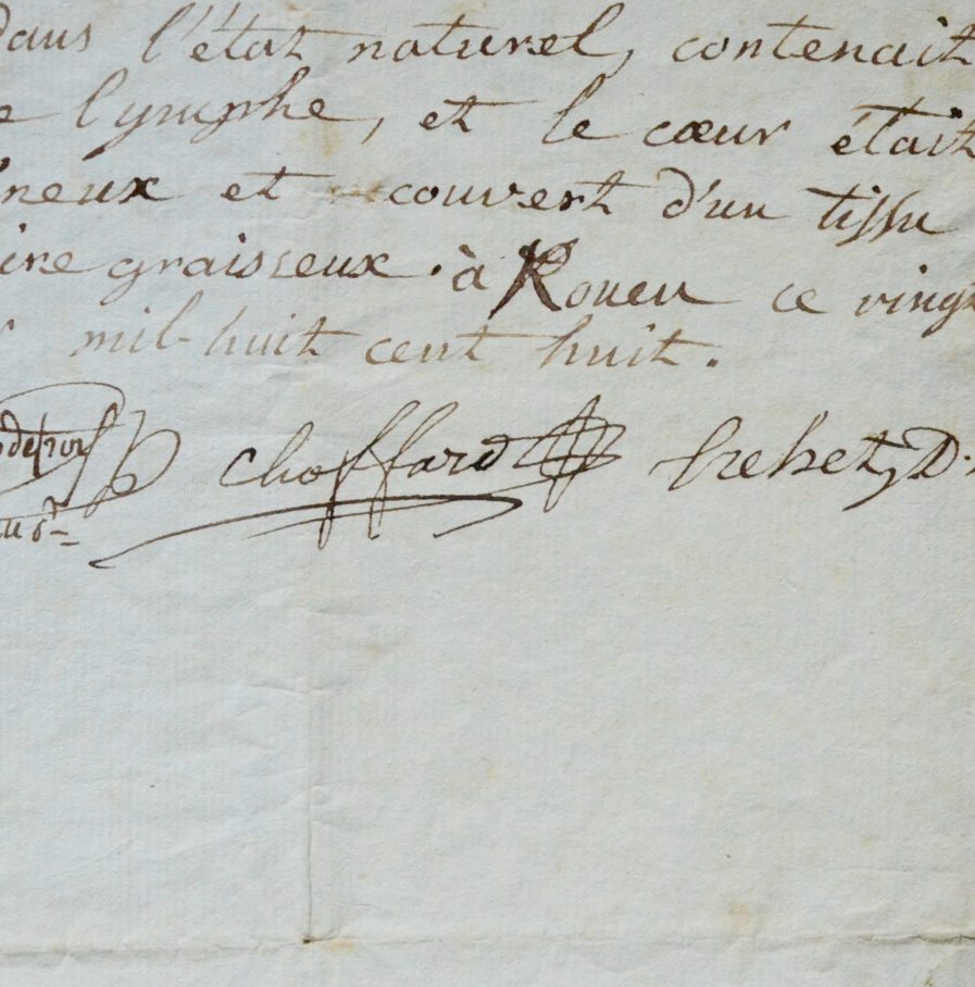 Compte rendu manuscrit de l'autopsie d'un utérus, signé par le chirurgien Choffard et le médecin Godefroy, à Rouen.