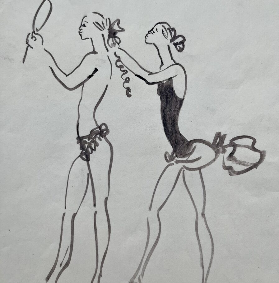 Dessin à l’encre d’Yves Saint-Laurent figurant deux ballerines en costume de scène