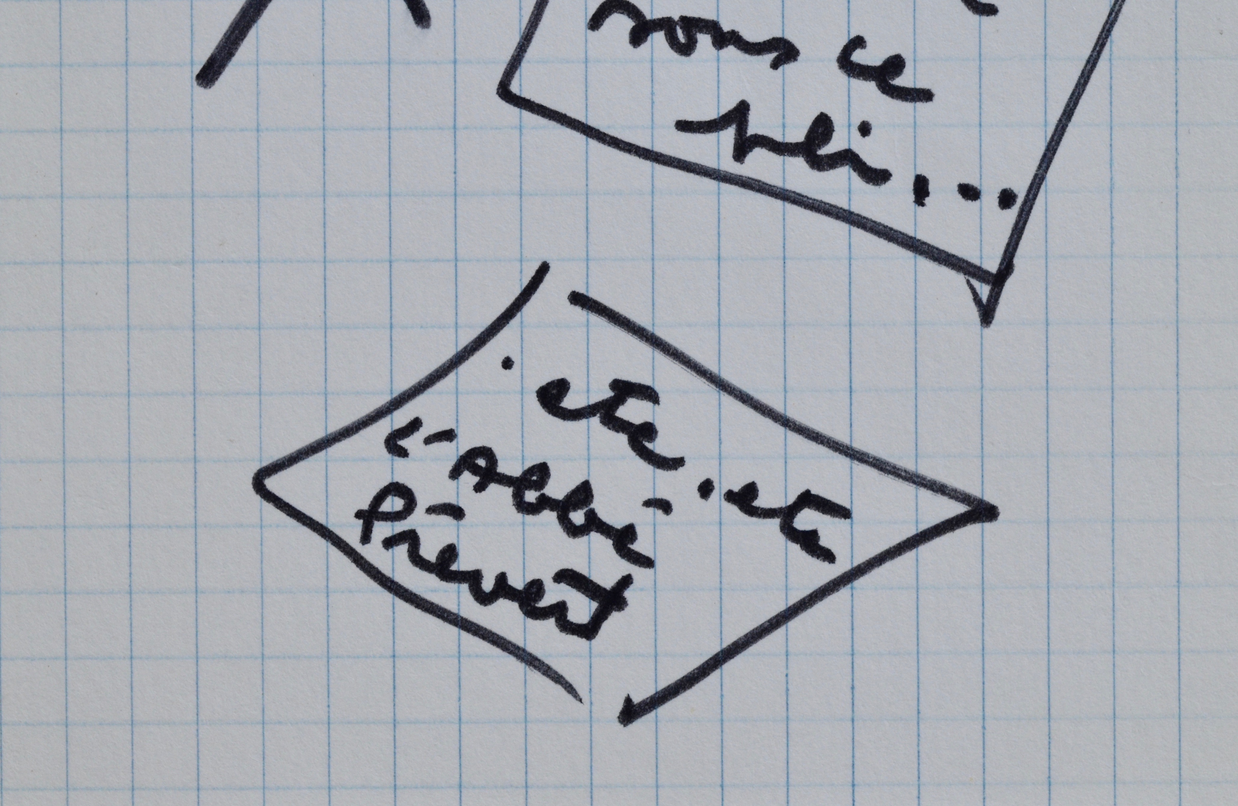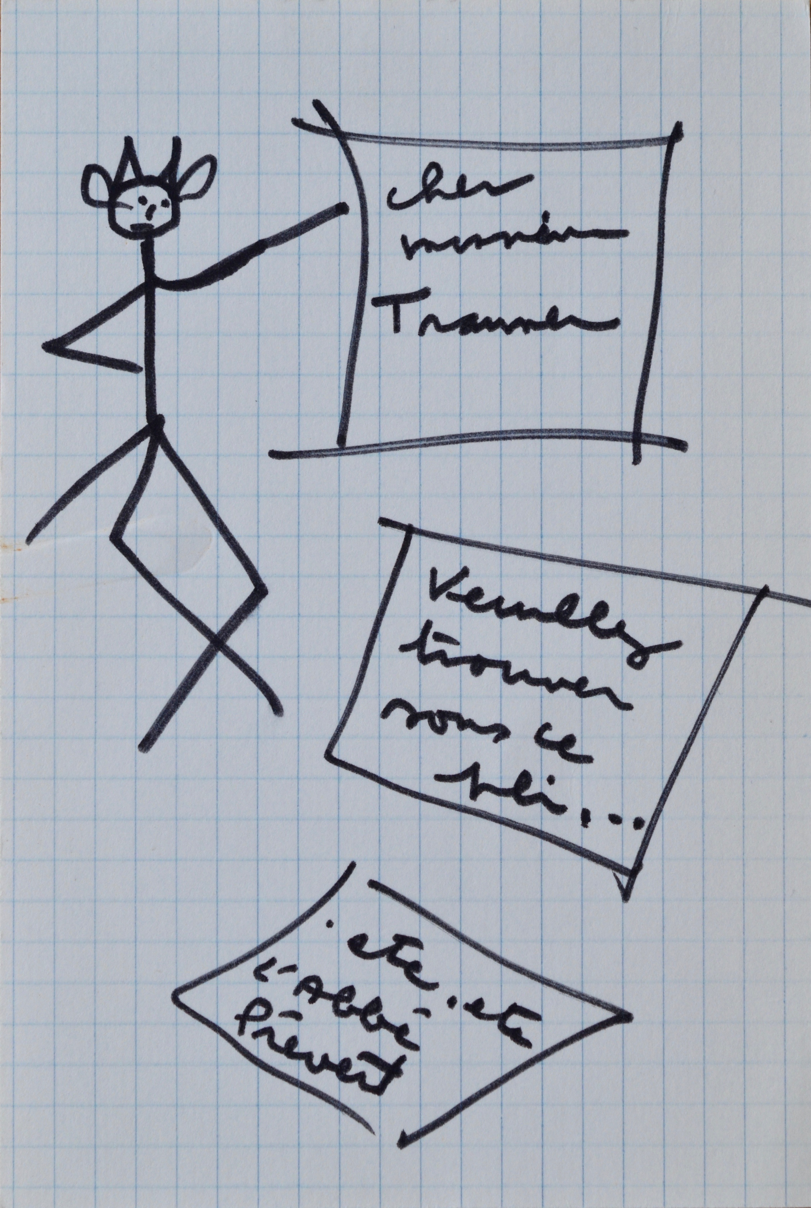 Il représente un personnage de style enfantin et trois messages encadrés : "Cher Monsieur Trauner", "Veuillez trouver sous ce pli" - "Etc, etc. L'Abbé Prévert".