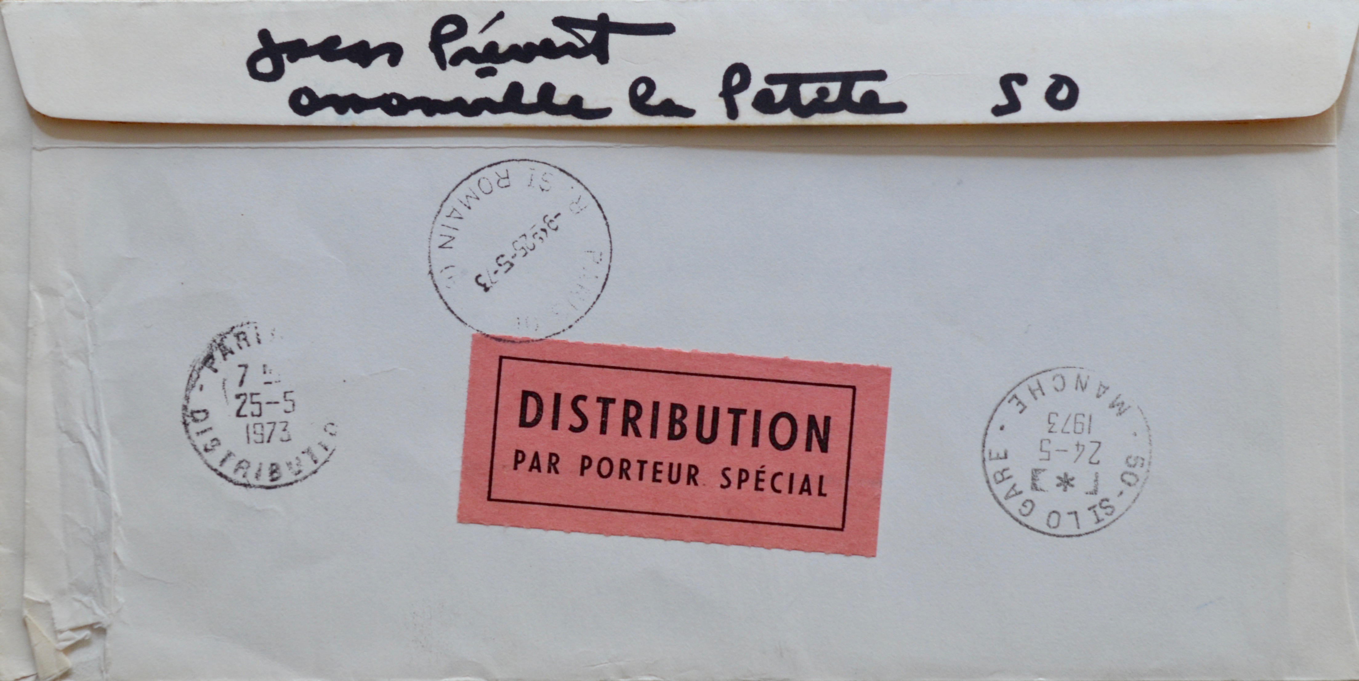 Feutre noir sur papier bristol à petits carreaux. Timbres et marques postales sur l'enveloppe. Deux étiquettes "Distribution par porteur spécial".