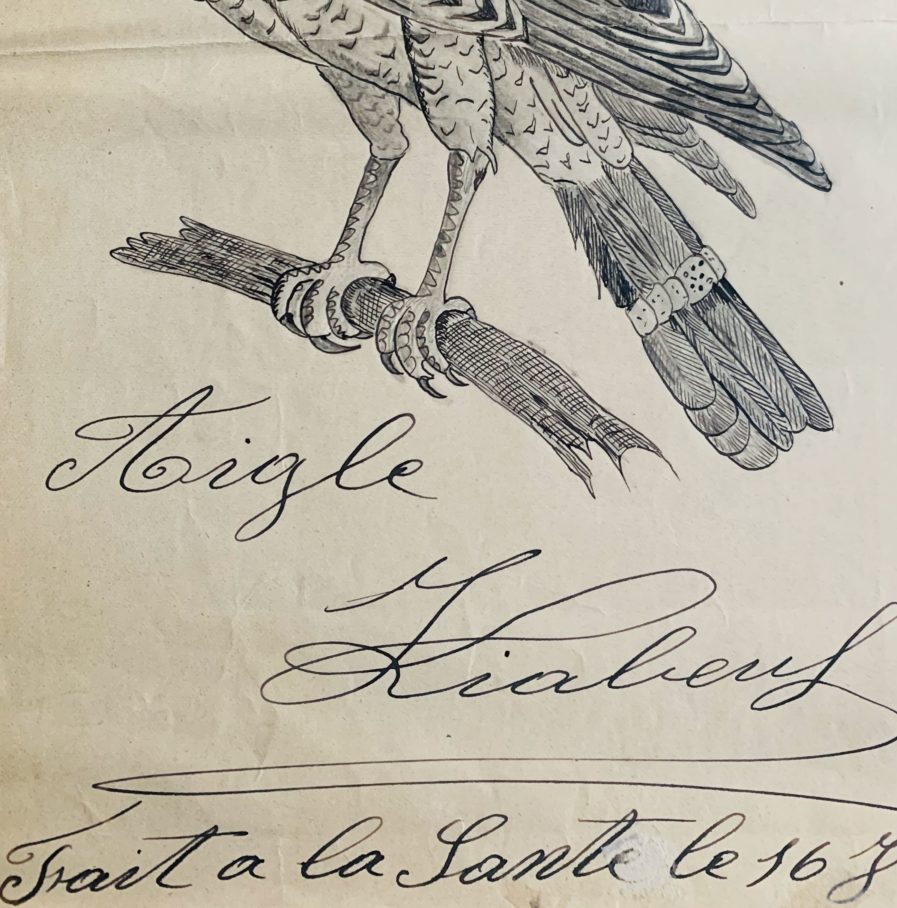 Le dessin représente un aigle sur une branche ; il est réalisé à l'encre noire et au crayon. Liabeuf l'offre "à mon excellent défenseur Maître Lucien Leduc".