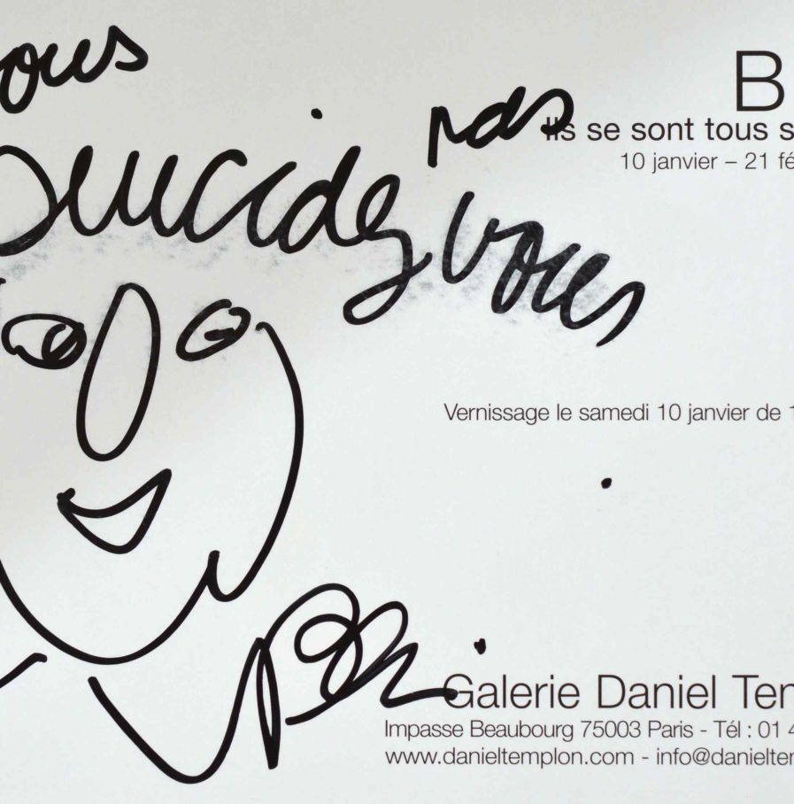 Au dos d'une carte de son exposition "Ils se sont tous suicidés", réalisée à la galerie Templon de Paris, Ben signe un dessin (tête d'homme) et ajoute au dessus "ne vous suicidez vous pas".