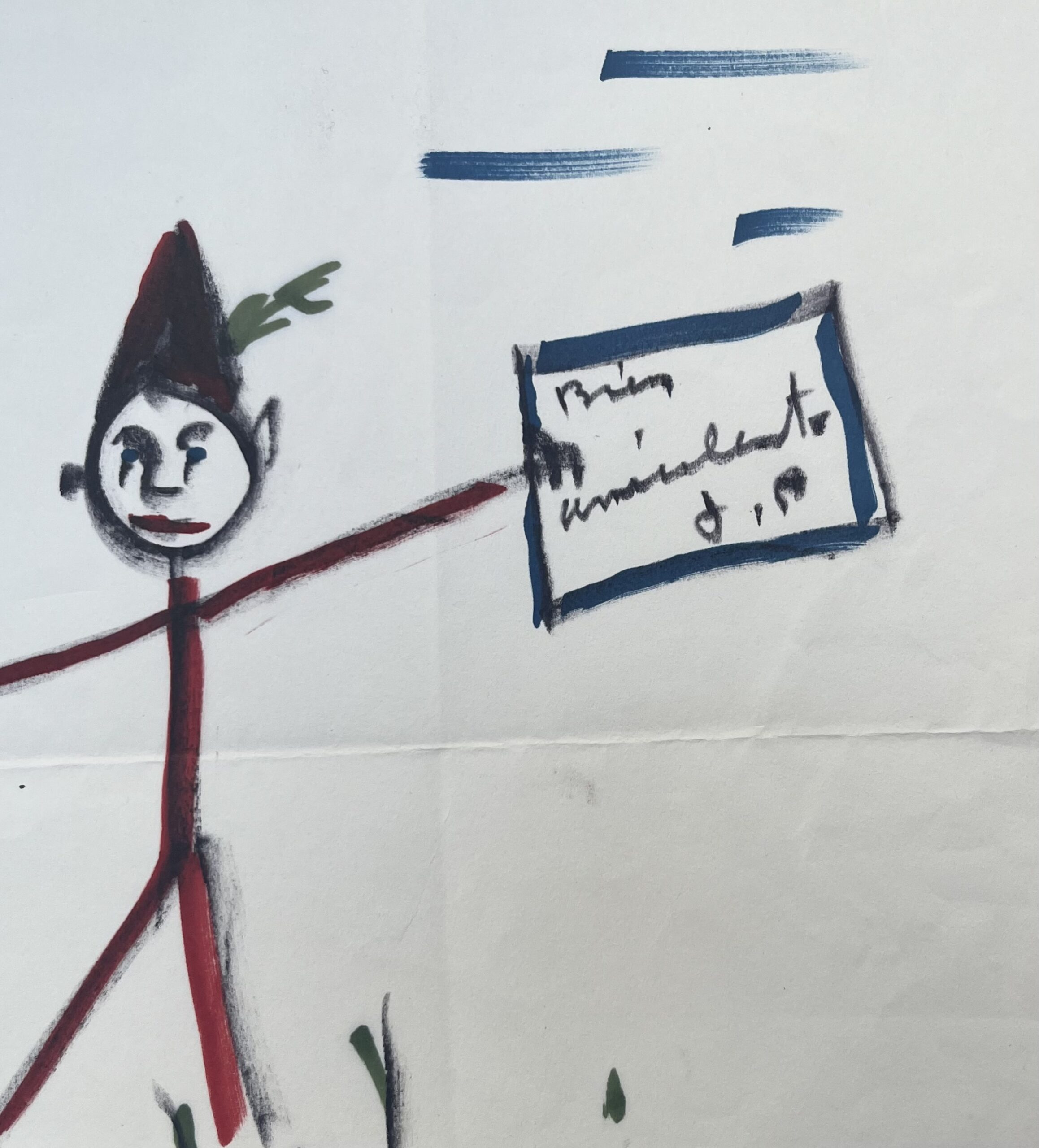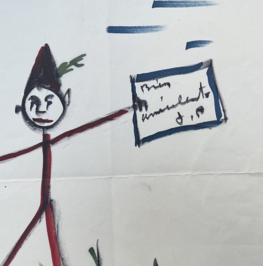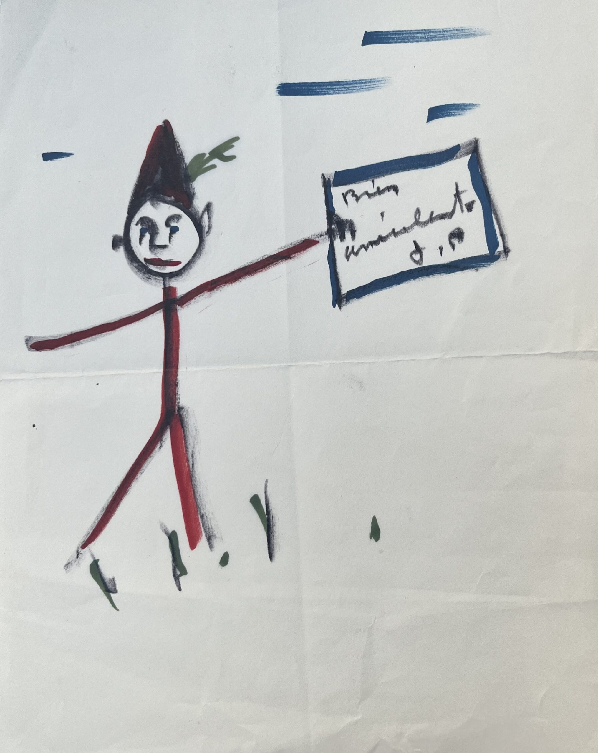 Il représentant un personnage filiforme, de rouge vêtu chapeau pointu, tenant un écriteau avec cette légende : "Bien amicalement J.P.".