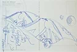 Dessin original de Philippe Druillet, au stylo à bille bleu, réalisé au dos d'une carte de "Bleu du désert, suite à Salammbô".