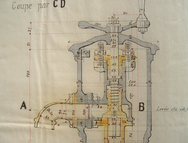 Plusieurs vues en coupe, à l'encre avec rehauts d'aquarelle. Page de titre attachée : "Chemins de fer de Paris à Lyon et à la Méditerranée. Matériel fixe. Borne-fontaine modèle PLM".
