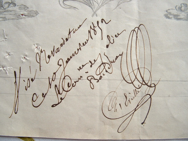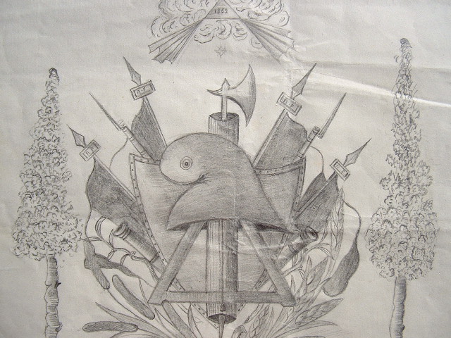 Dessin à la mine de plomb figurant divers attribus de la République : arbres de la liberté, bonnet phrygien, drapeaux de la République, canons, épis de blé, etc., et une date, 1852. En bas figure le visa du commissaire de police, Boudray, daté du 10 janvier 1852, et une autre signature, G. Eveillé. Il pourrait s'agir d'un projet d'étendard pour un corps de défense des vertus républicaines. Il s'inscrit dans le contexte du coup d'Etat du 2 décembre 1851 de Louis-Napoléon Bonaparte.