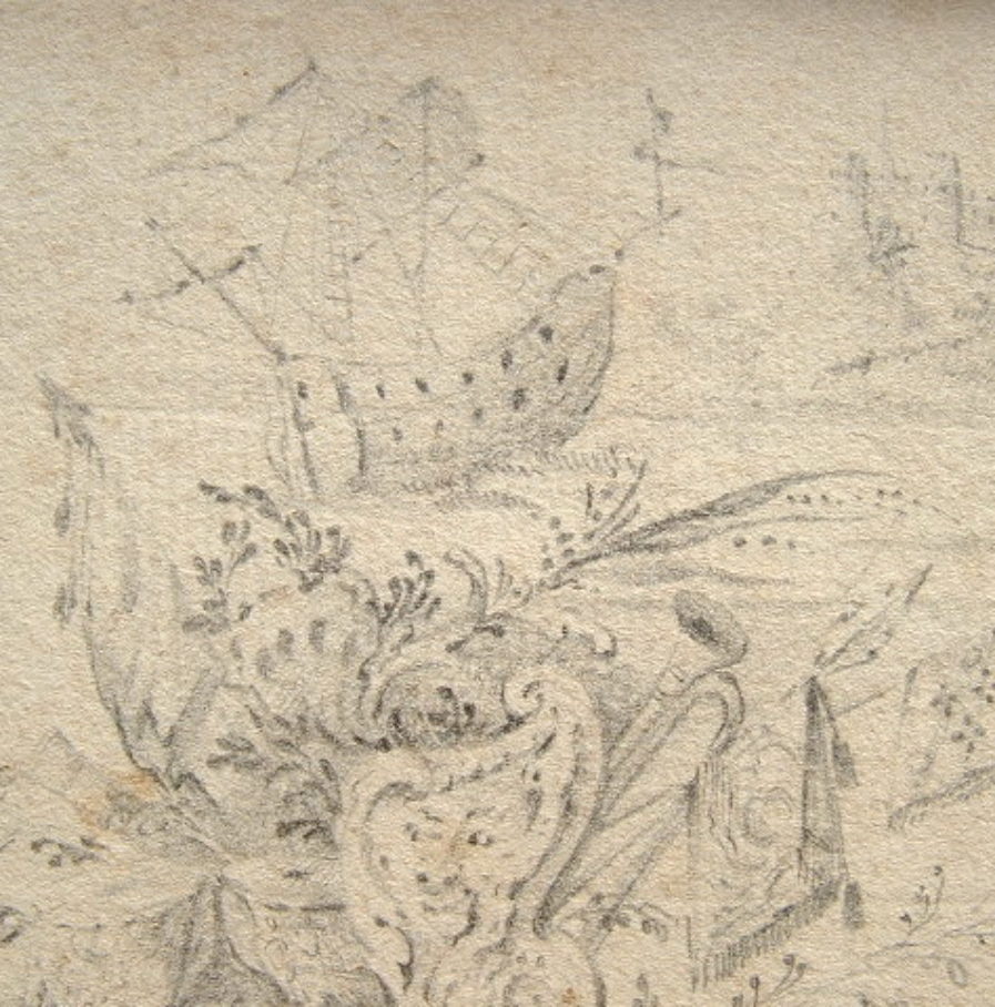 2 dessins, sur une même feuille, à la mine plomb, de décors de cul de lampe : scène de marine et calèche.