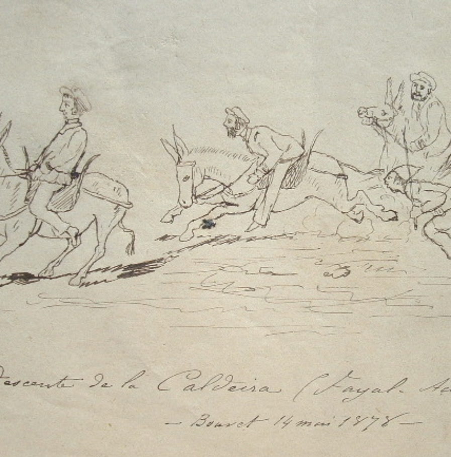3 dessins à la plume sur 2 feuillets : "Descente de la Caldeira (Fayal, Açores). Bouvet, 14 mai 1878" représentant 4 cavaliers dont un désarçonné, "Costumes des femmes à Fayal" (3 vues d'une femme en costume traditionnel) et "Pico-wine y Paõ doce (Fayal hôtel)" (table avec fromage, bouteille et verres). Dessins non signés.