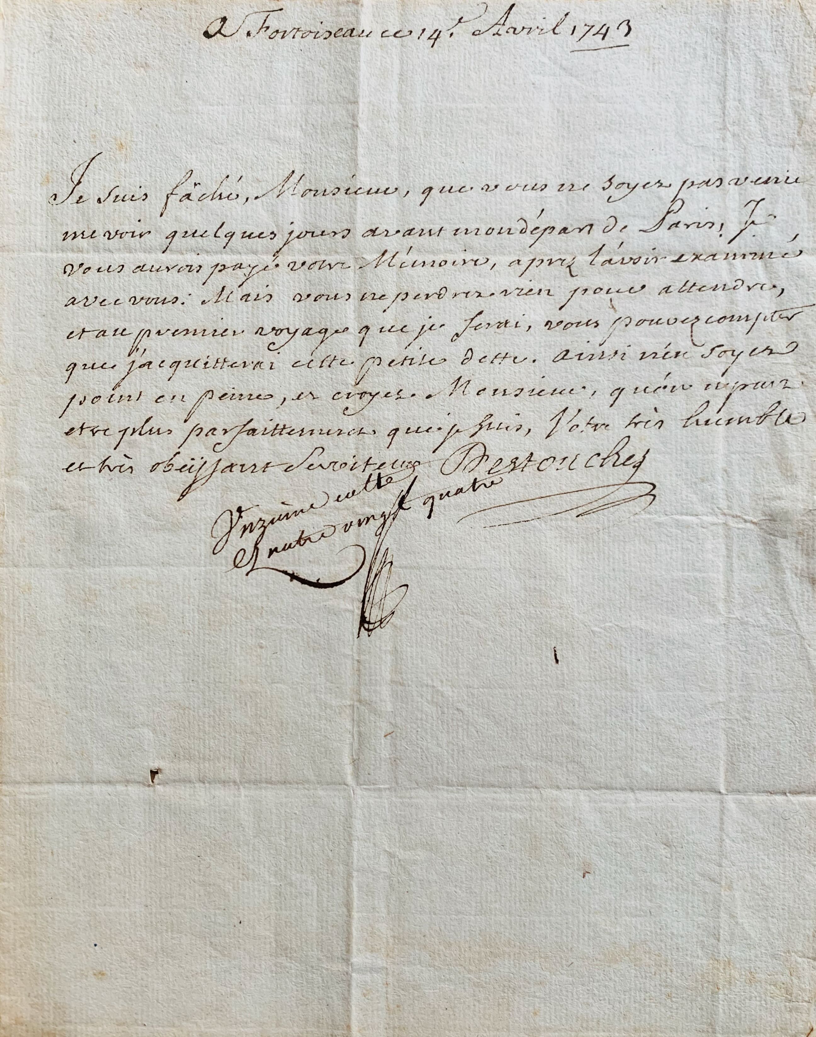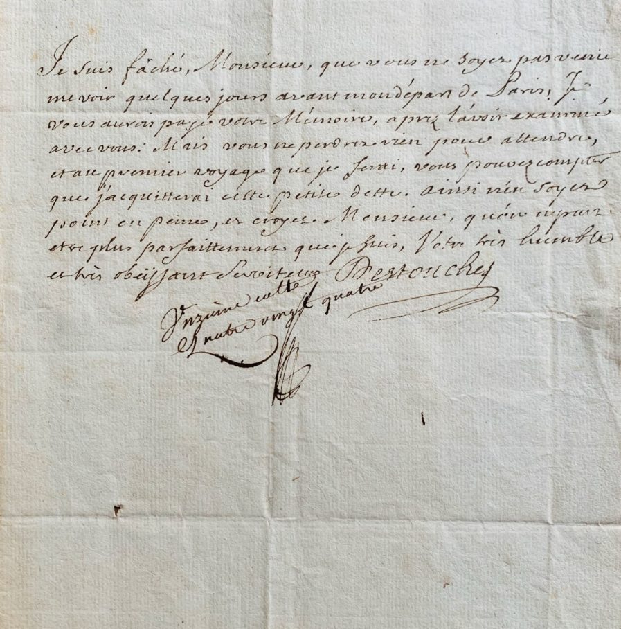 Il regrette que son correspondant ne soit pas venu le voir lorsqu'il était à Paris. "je vous aurois payé votre mémoire, après l'avoir examiné avec vous. Mais vous ne perdez rien pour attendre, et au premier voyage que je ferai, vous pouvez compter que j'acquitterai cette petite dette. Ainsi n'en soyez point en peine [...]".