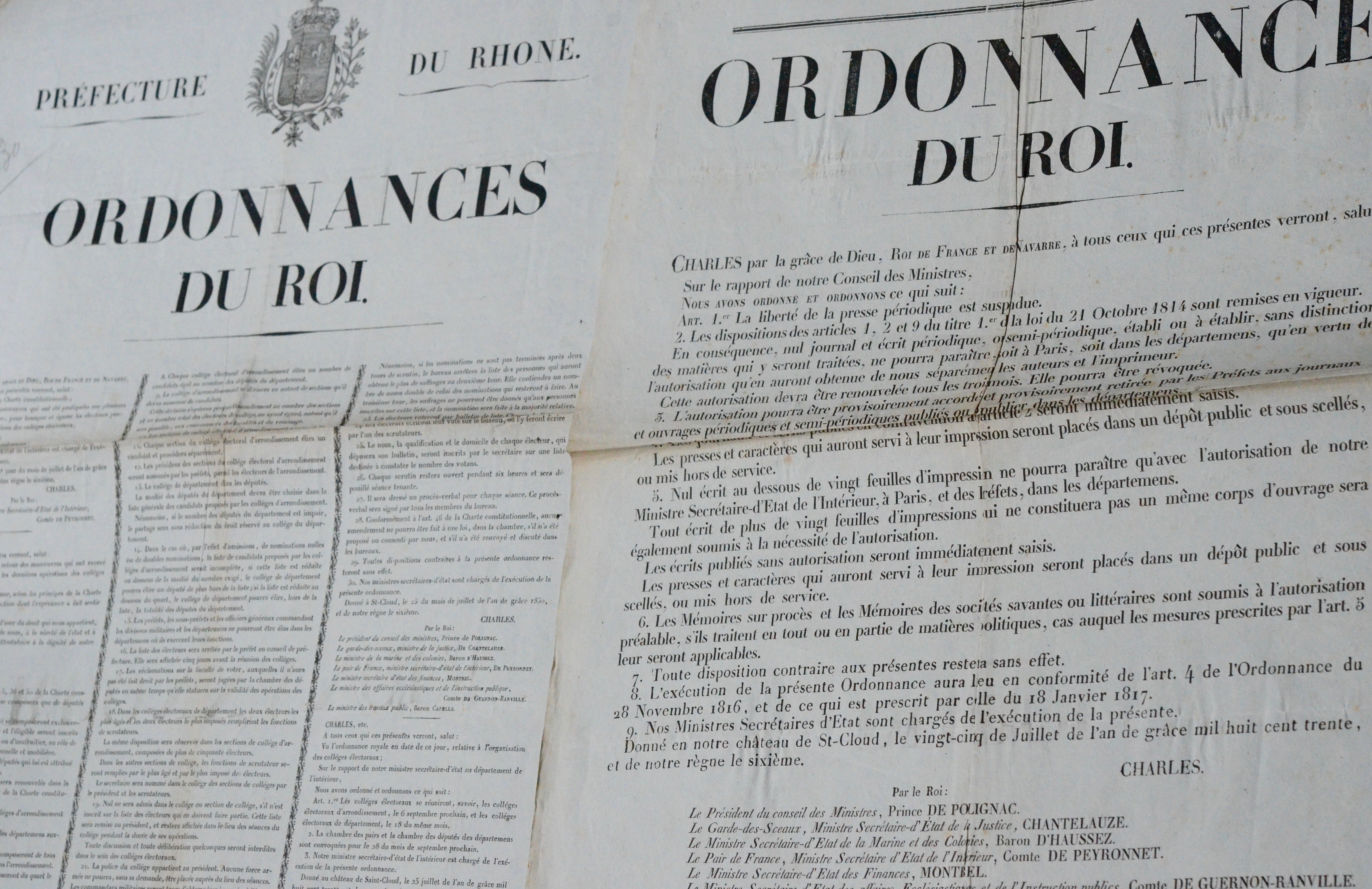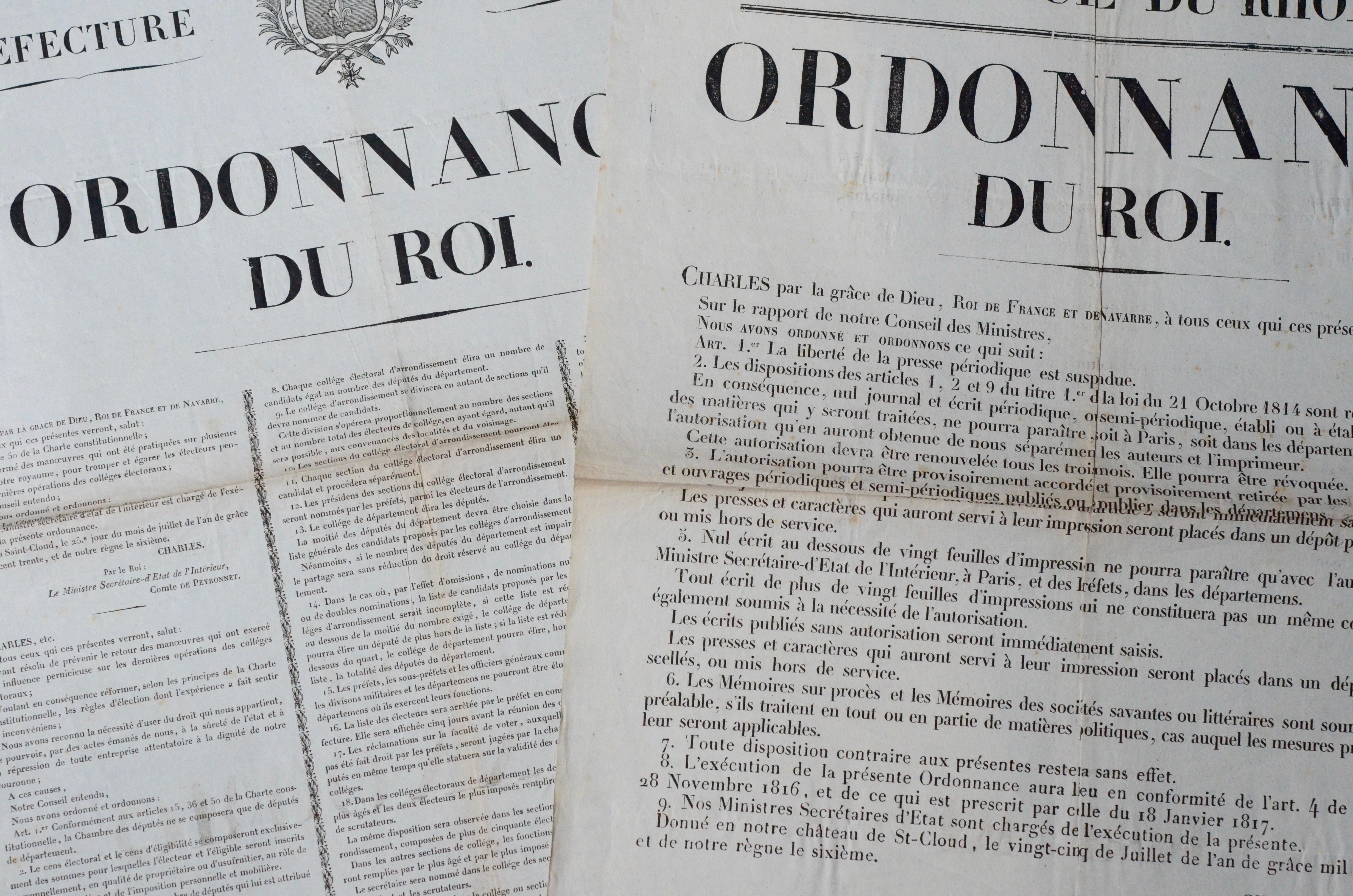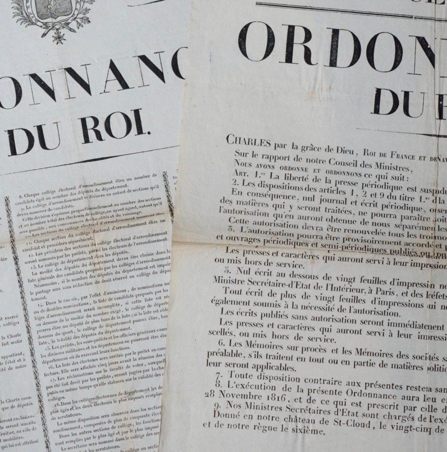 - Ordonnance du Roi Charles X relative à la liberté de la Presse, édictée le 25 juillet 1830 à Saint-Cloud. "Art.1 La Liberté de la Presse périodique est suspendue [...]". Les écrits publiés "sans autorisation seront immédiatement saisis", etc.