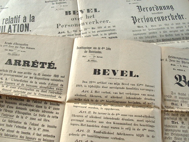 Deux arrêtés du général Michel, commandant l'armée d'occupation de la 4e zone des pays rhénans, imprimés en affiches trilingues : le premier interdit "la vente d'alcool de bouche, de liqueurs et de boissons alcoolisées", le second rend libre la circulation dans toute la zone occupée "quel que soit le mode de locomotion employé, entre 4 et 23 heures, sous condition d'être porteur de sa carte d'identité [...]".