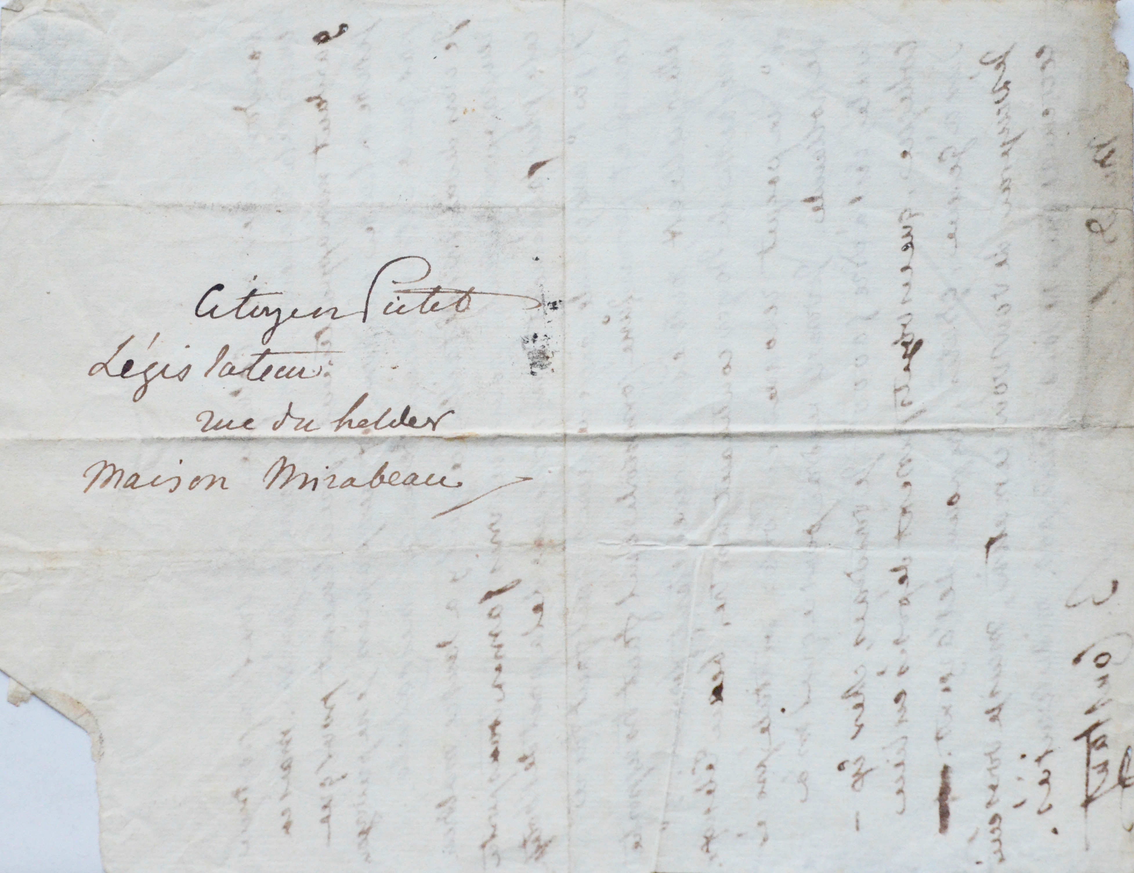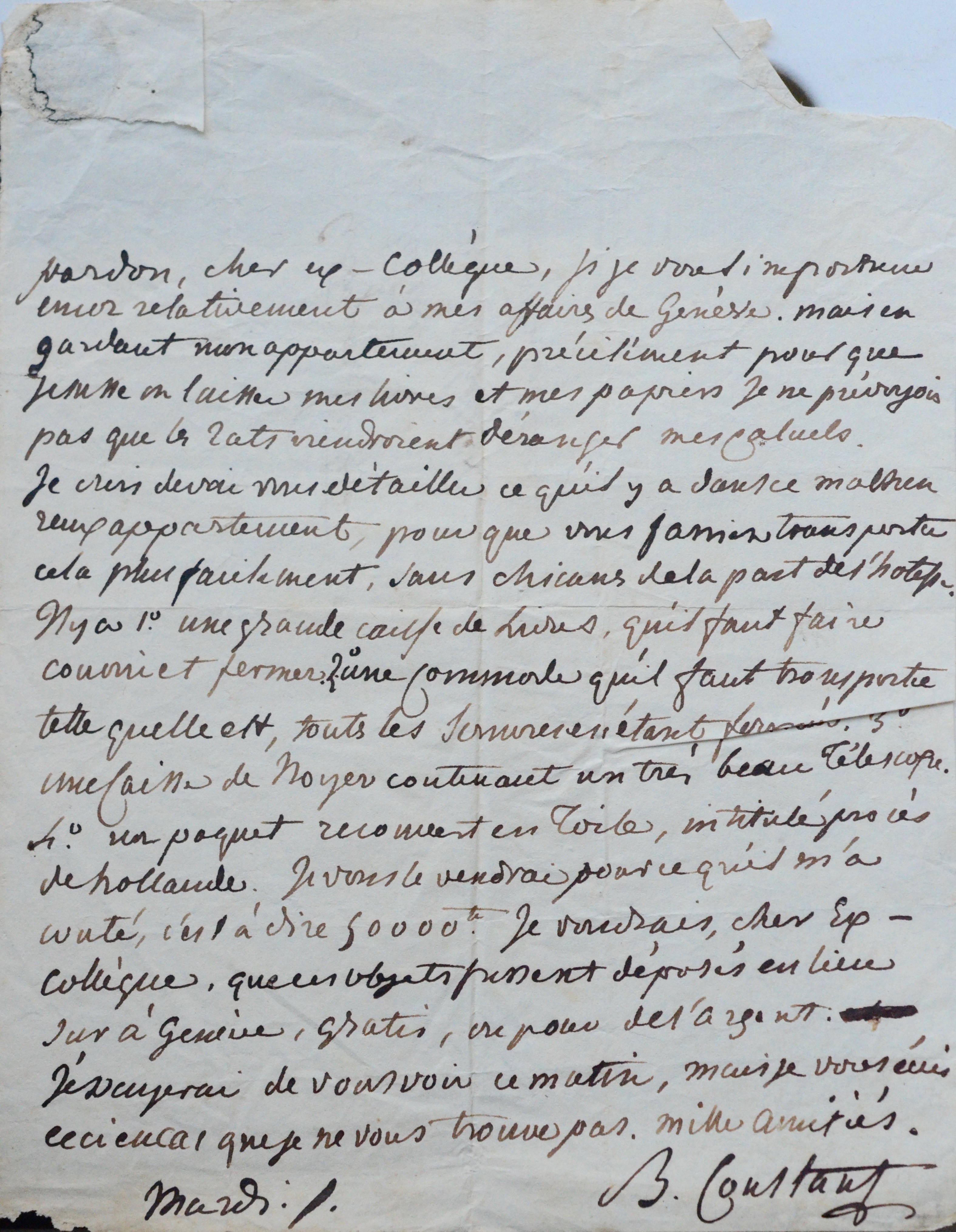 -Lettre détaillant ses effet personnels qu'il veut faire déménager : "Pardon, cher ex-collègue, si je vous importune encore relativement à mes affaires de Genève, mais en gardant mon appartement, précisément pour que [?] on laisse mes livres et mes papiers. Je ne prévoyais pas que les rats viendroient déranger mes calculs. Je crois devoir vous détailler ce qu'il y a dans ce malheureux appartement, pour que vous fassiez transporter cela plus facilement, sans chicanes de la part de l'hôtesse. Il y a 1° une grande caisse de livres, qu'il faut faire couvrir et fermer. 2° une commode qu'il faut transporter telle quelle est, toutes les serrures étant fermées. 3° une caisse de Noyer contenant un très beau télescope. 4° un paquet recouvert de toile, intitulé Procès de Hollande. Je vous le vendrai pour ce qu'il m'a couté, c'est à dire 50 000# [...]". Il souhaite que tout cela soit déposé en lieu sûr, "gratis, ou pour de l'argent".