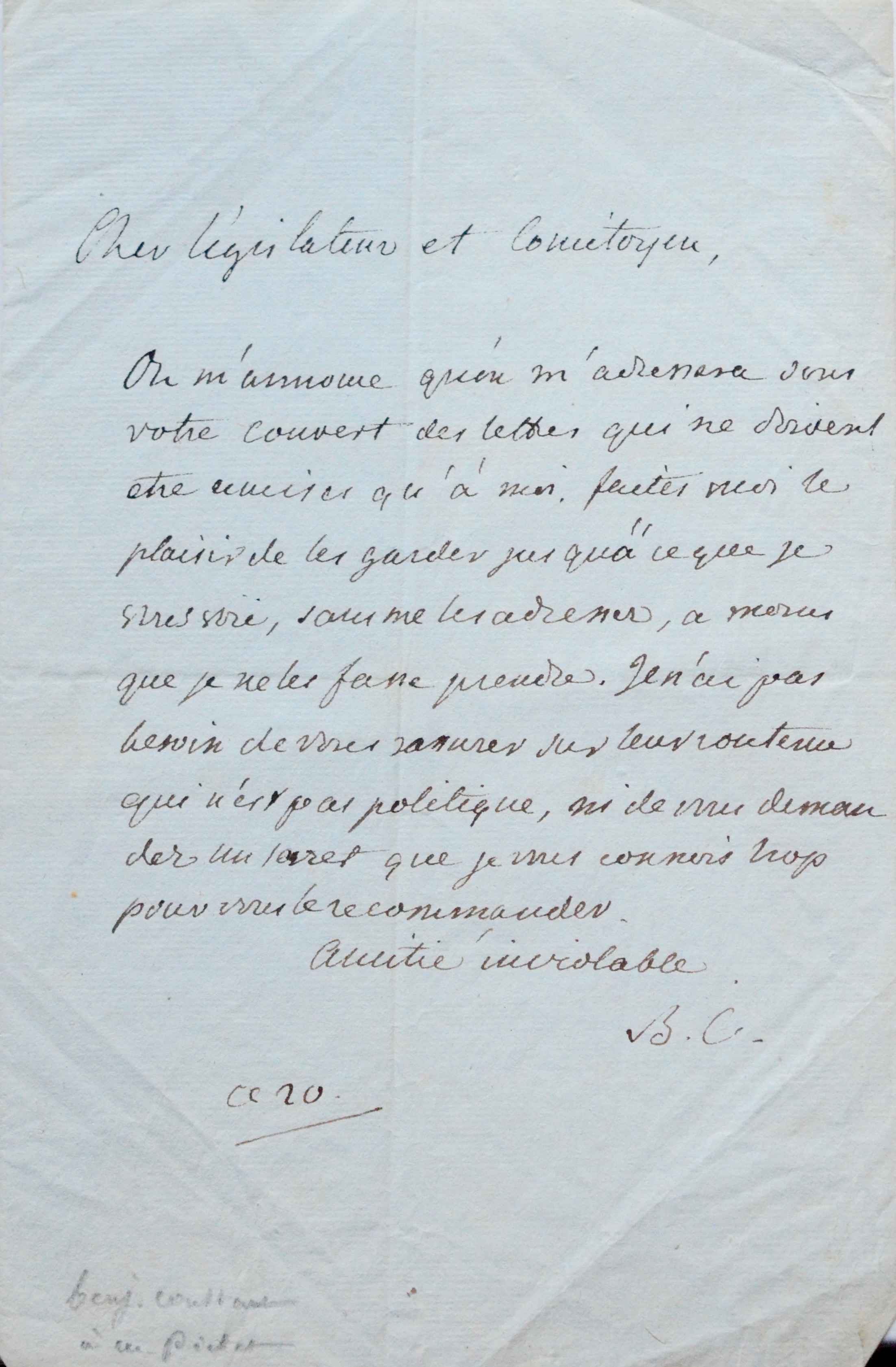 -"[...] On m'annonce qu'on m'adressera sous votre couvert des lettres qui ne doivent être remises qu'à moi. Faites moi le plaisir de les garder jusqu'à ce que je [?], sans me les adresser, à moins que je ne les fasse prendre. Je n'ai pas besoin de vous rassurer sur leur contenu qui n'est pas politique, ni de vous demander un secret que je vous connais trop pour vous le recommander. Amitié inviolable [...]".