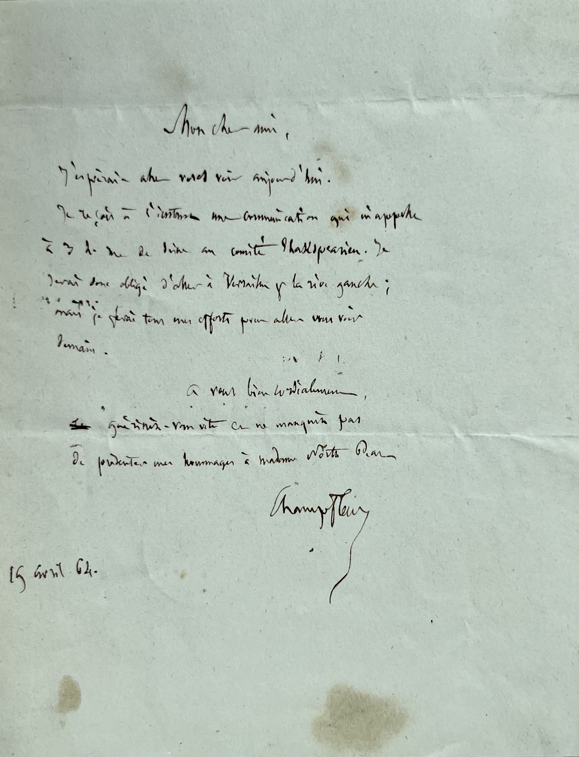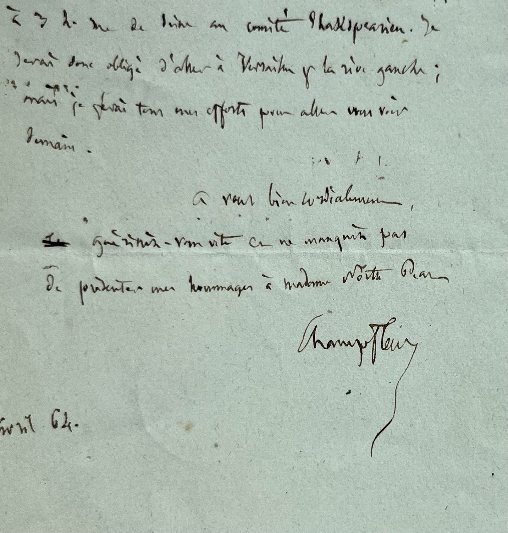 - Il espérait voir son ami, mais il reçoit une invitation au Comité Shakespearien qui l'oblige à se rendre à Versailles, "mais je ferai tous mes efforts pour aller vous voir demain [...]".