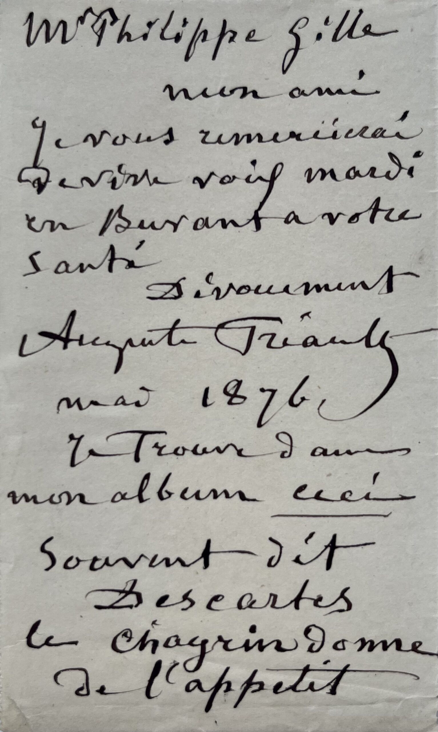 - "Mon ami, je vous remercierai de vive voix mardi en buvant à votre santé. Dévouement. Auguste Préault mai 1876. Je trouve dans mon album ceci : Souvent dit Descartes le chagrin donne de l'appétit".