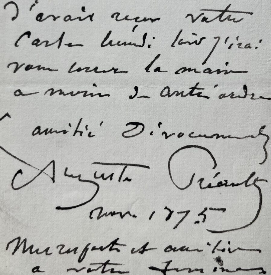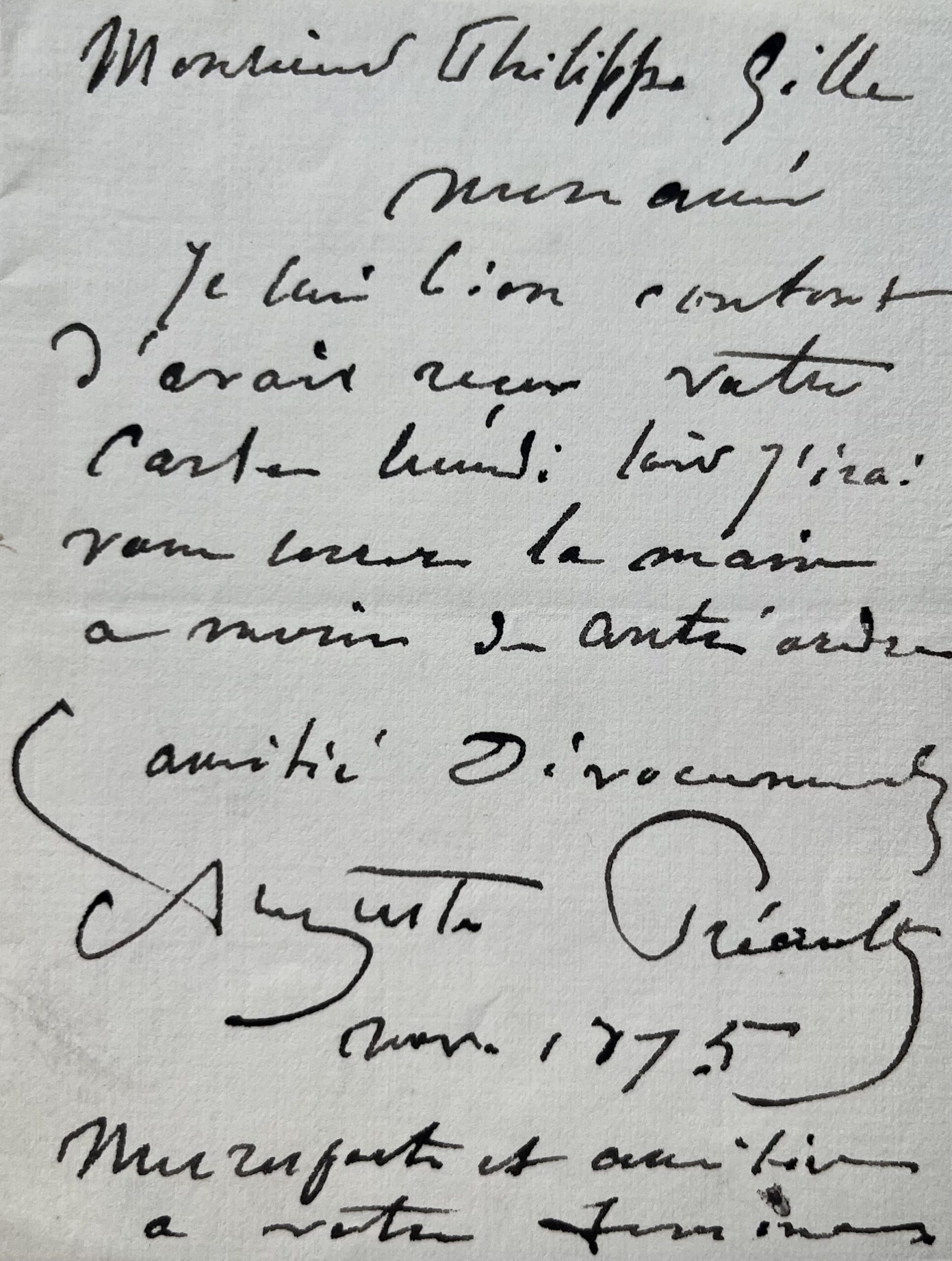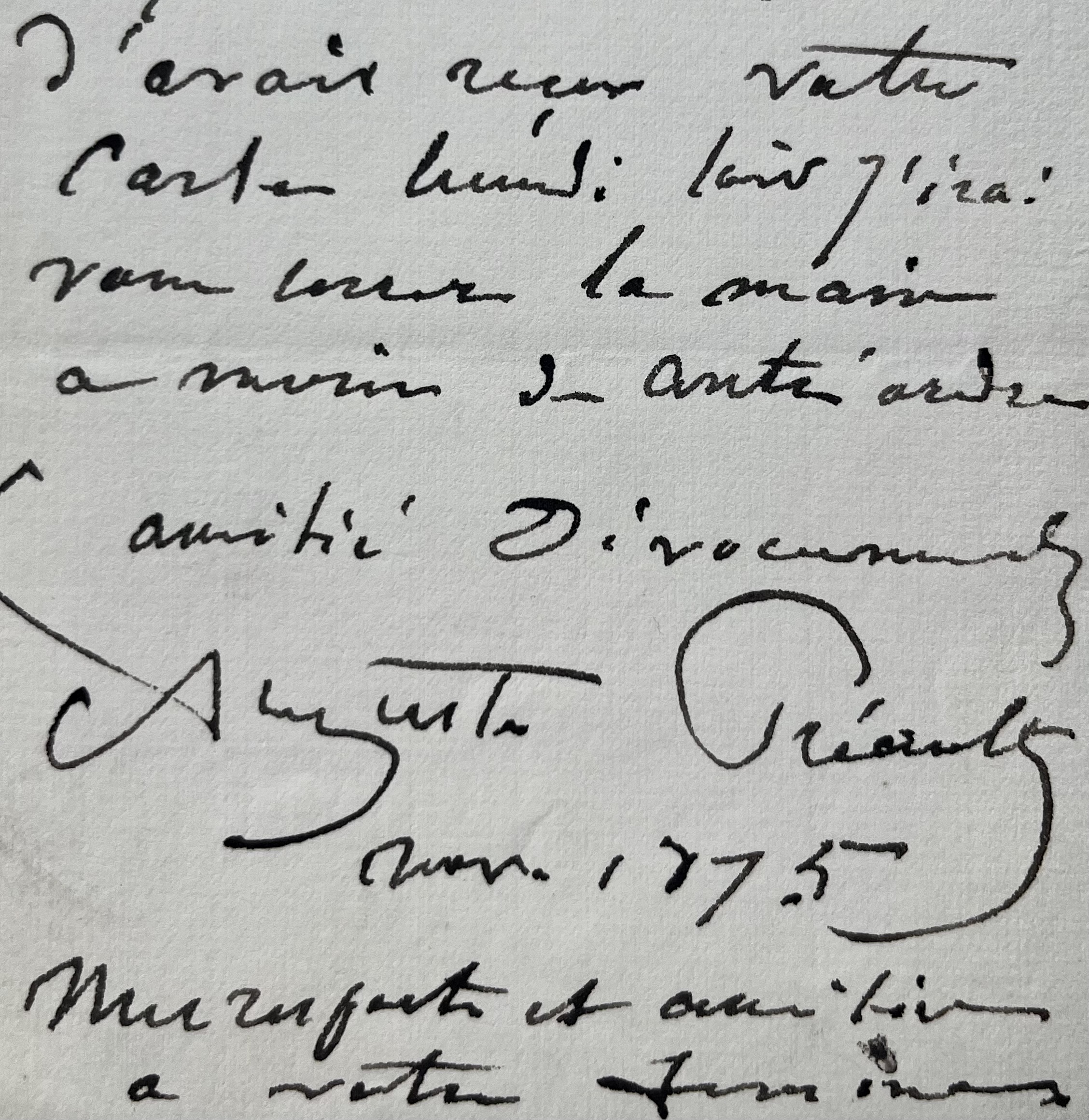 - "Mon ami, je suis bien content d'avoir reçu votre carte lundi soir j'irai vous serrer la main à moins d'un contre ordre. Amitié. Dévouement. Auguste Préault nov. 1875. Mes respects et amitié à votre femme"