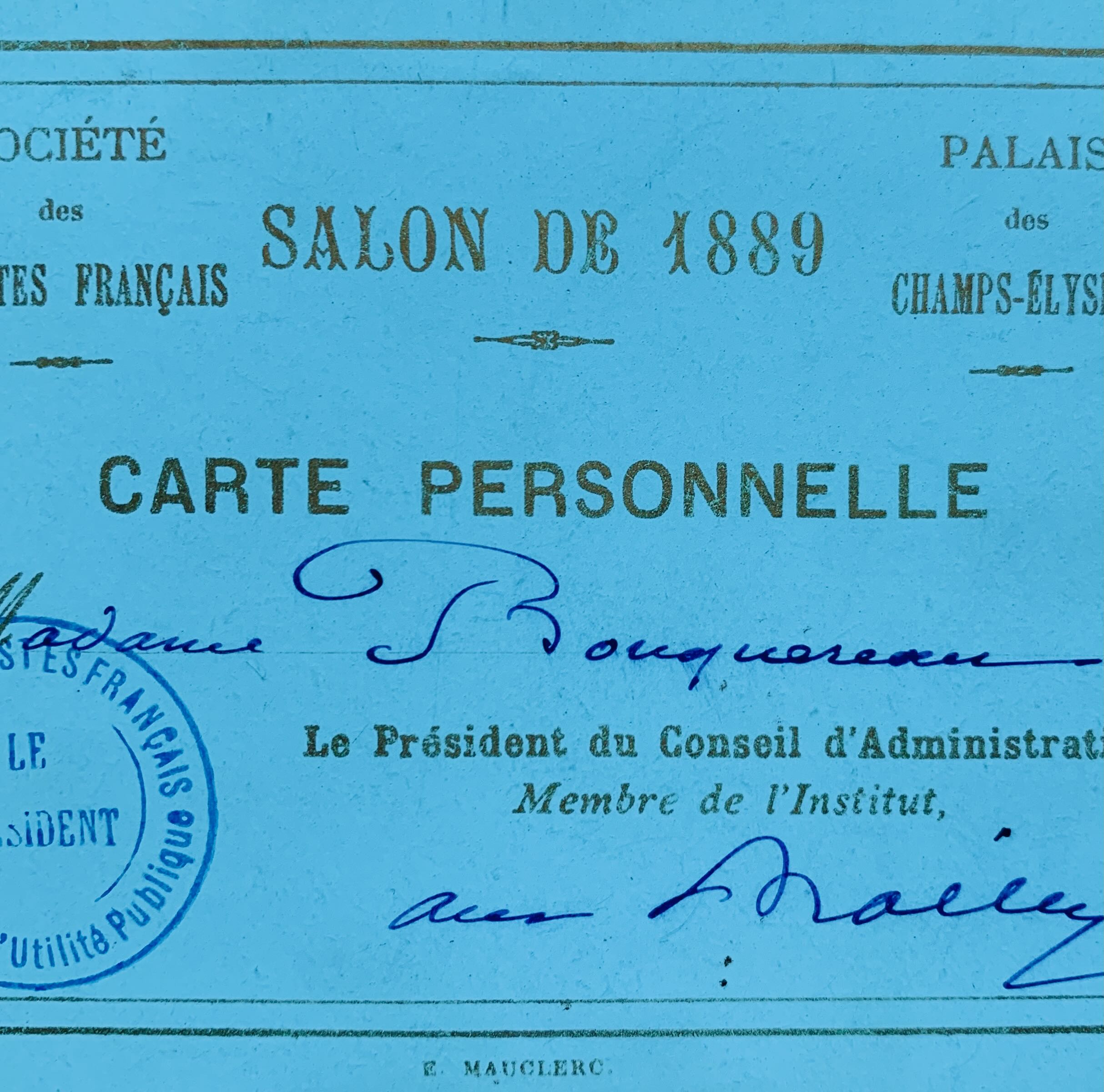 2 cartes personnelles d’entrée aux Salons de 1889 et de 1891 pour l'épouse de William Bouguereau, complétées et signées par Antoine-Nicolas BAILLY (1810-1892), président fondateur de la Société des artistes français, organisateur du Salon.