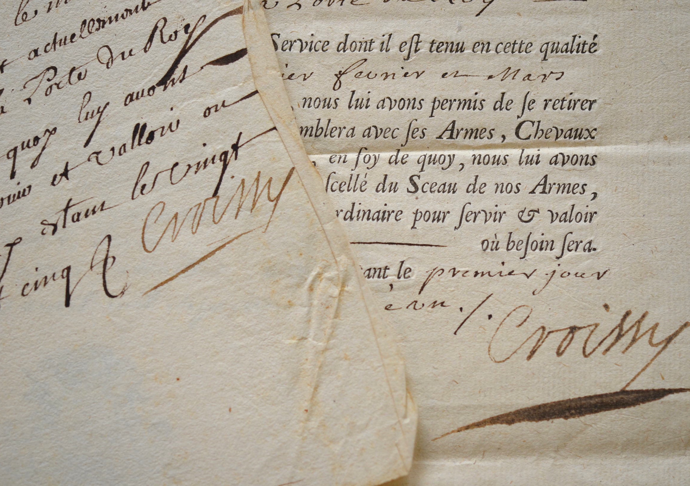 Jean-Baptiste-Joachim Colbert (de Croissy) (Paris, 1703/1777)Le premier certificat, établi par « Jean-Baptiste Joachim Colbert chevalier Marquis de Croissy, Conseiller du Roy en ses Conseils, Capitaine des Gardes de la Porte de Sa Majesté & Mestre de Camp du Régiment Royal, Infanterie », atteste que Pierre Farge, écuyer, « est actuellement de service en ladite qualité de Garde de la Porte du Roy tant et bon qu'il nous plaira ». Le second certificat, en partie imprimé et établi par le même, atteste de la même fonction pour Pierre Farge, auquel il est « permis de se retirer chez lui ou ailleurs, où bon lui semblera avec ses Armes, Chevaux & Bagages, jusqu'à nouvel ordre ». Celui-ci est contresigné par le Secrétaire ordinaire, Guyard de Talma.