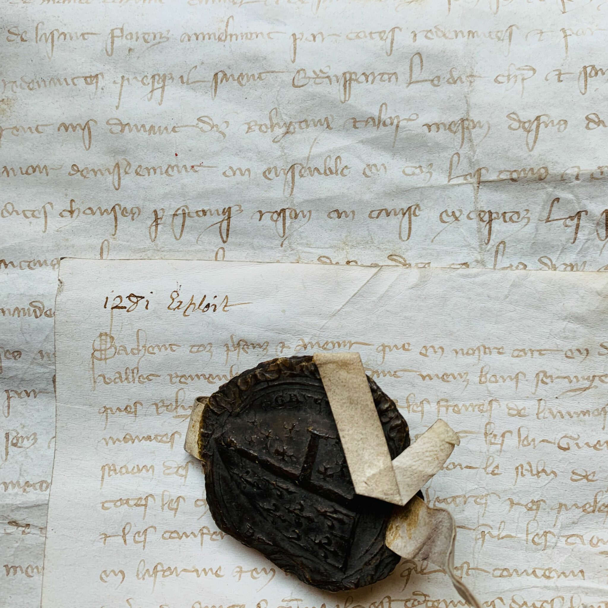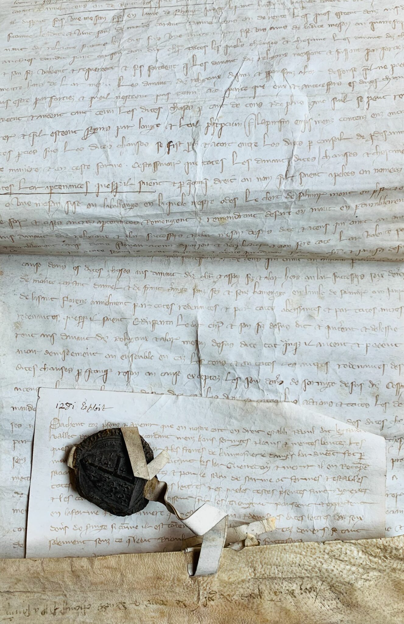 Deux chartes du XIIIe siècle, scellées ensemble par un sceau en cire brune (5 cm de diamètre, belle empreinte, légende en partie rognée, avec contre-sceau). Angers, « mardi avant la saint Maurille » et « samedi davant pasques » 1281 et 1282. En français. Entièrement transcrites. Documentation jointe.