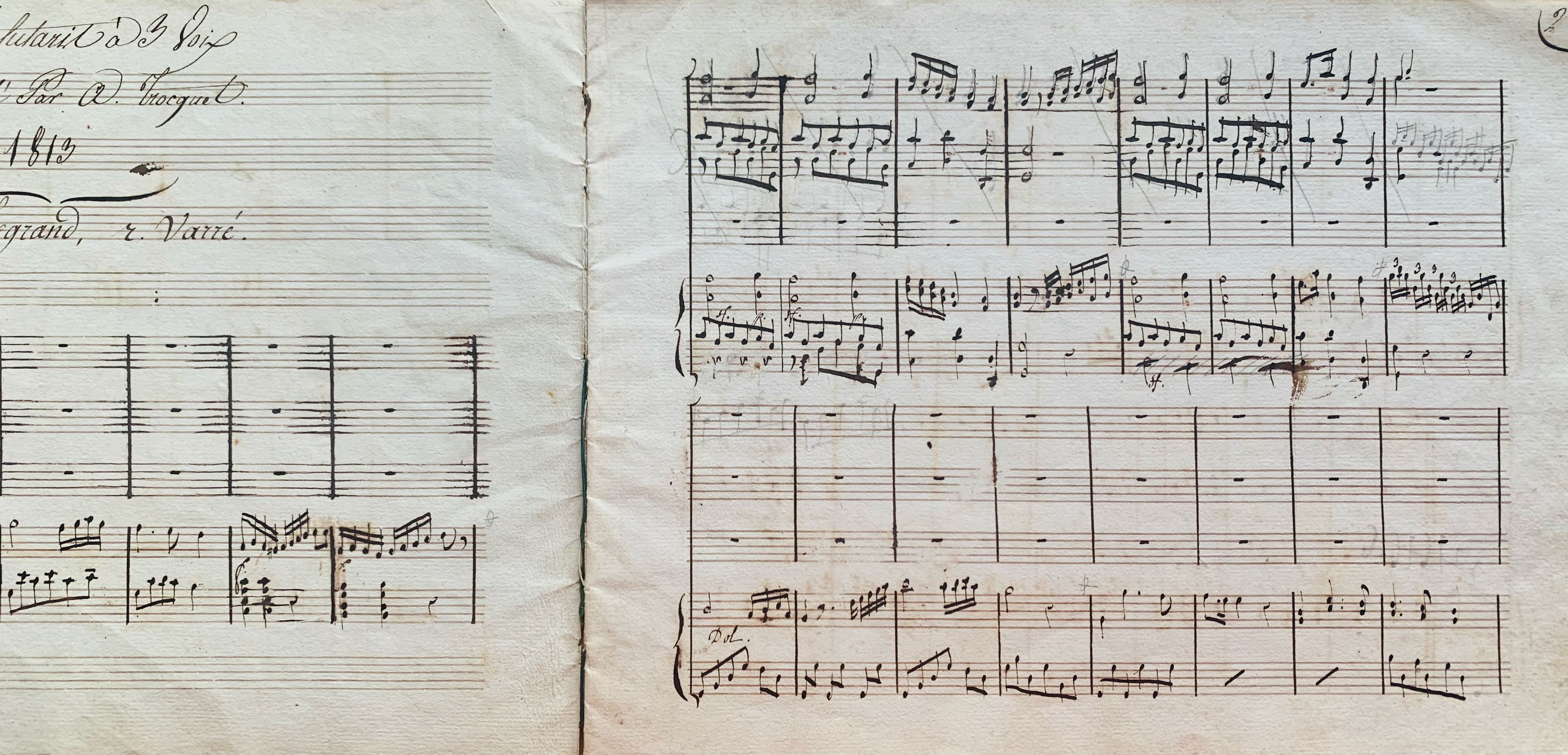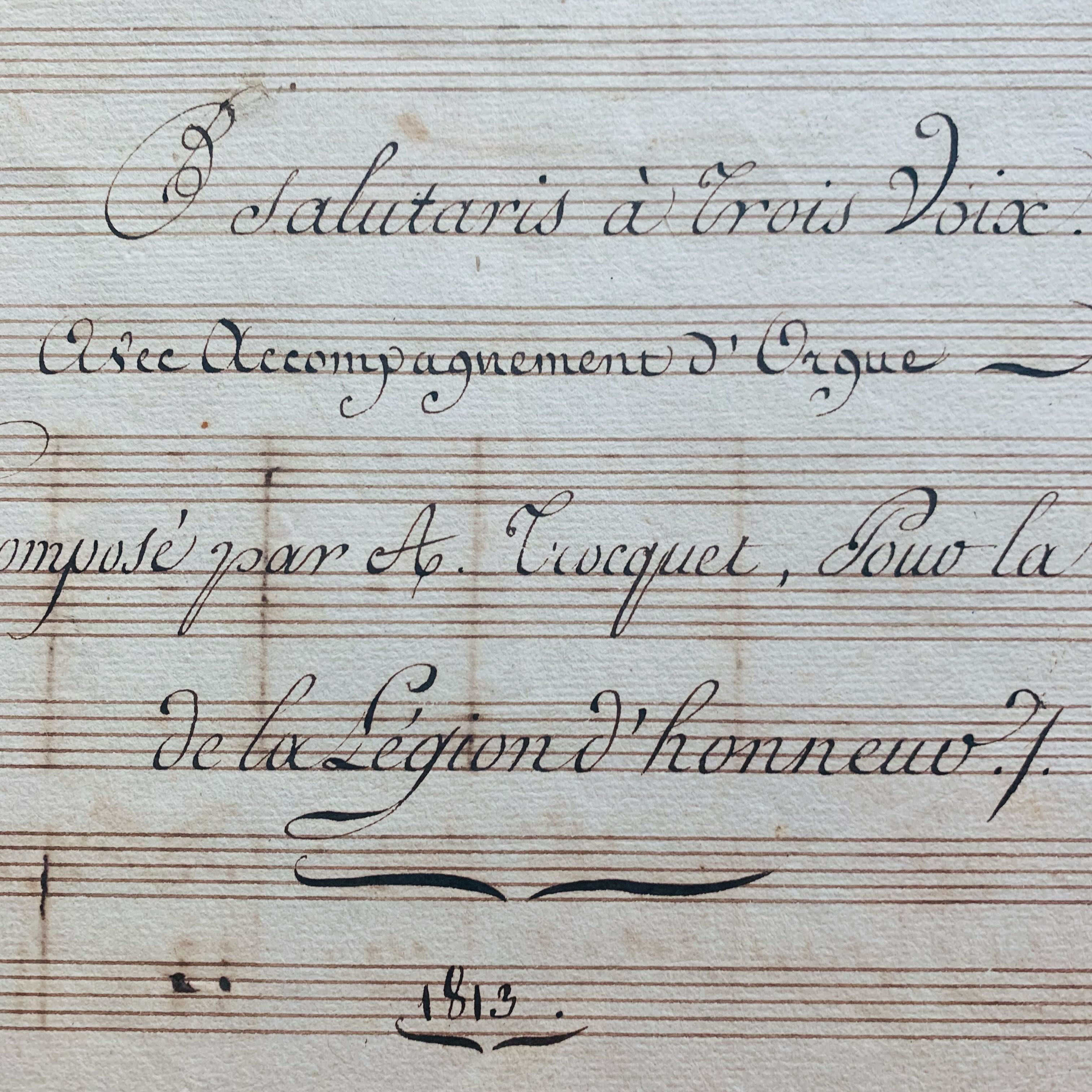 Deux manuscrits musicaux d'Auguste Trocquet pour la Maison de la Légion d'honneur de Saint-Denis : le premier est un "O salutaris" à trois voix, avec accompagnement d'orgue, composé en 1813 (titre + 8 pp. + 2 pp. d'additions, avec corrections). Le second, composé en 1814 durant la première Restauration pour la "Maison Royale de Saint-Denis", est un Agnus Dei avec deux soprani (3 pp.).