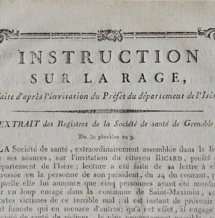 -Extravagant imprimé d’époque révolutionnaire, intitulé : "Instruction sur la rage, faite d'après l'invitation du Préfet du département de l'Isère.