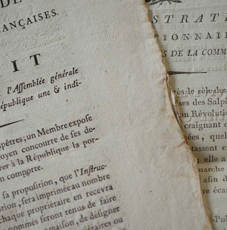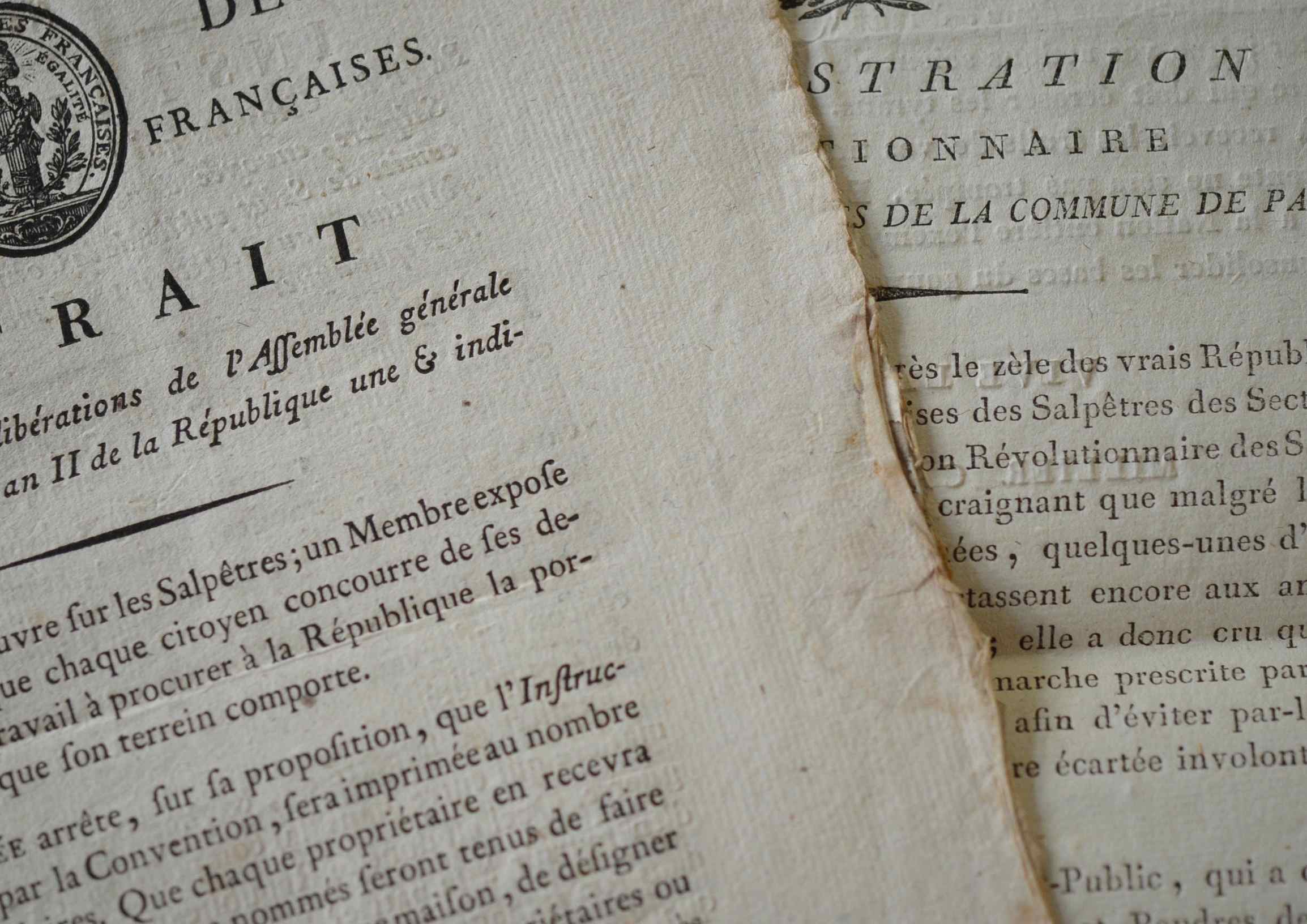 Deux imprimés révolutionnaires sur les poudres et salpêtres. Le premier de 2 pp. in-folio, qui émane de l'Administration révolutionnaire des salpêtres et poudres de la commune de Paris, précise le rôle et les attributions de cette administration nouvellement crée. Le second, de 8 pp. in-4, émane de la Section des Gardes Françaises (avec vignette) : extrait du registre des délibérations de l'assemblée générale du 15 nivose en 2, suivi d'une "Instruction pour les citoyens qui voudront exploiter eux-même du Salpêtre, envoyée dans toutes les municipalités par le comité de salut public de la Convention nationale, conformément au décret du 24 frimaire de l'an deuxième de la République", texte de Robespierre, Couthon, Carnot et autres membres du comité de Salut Public.