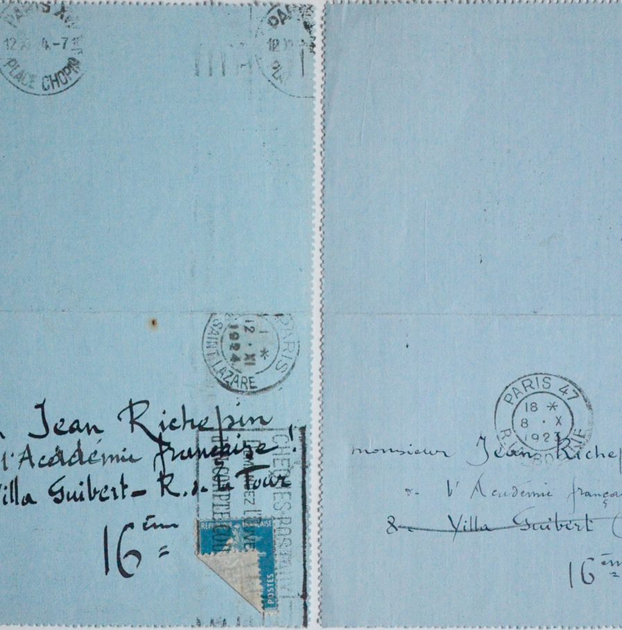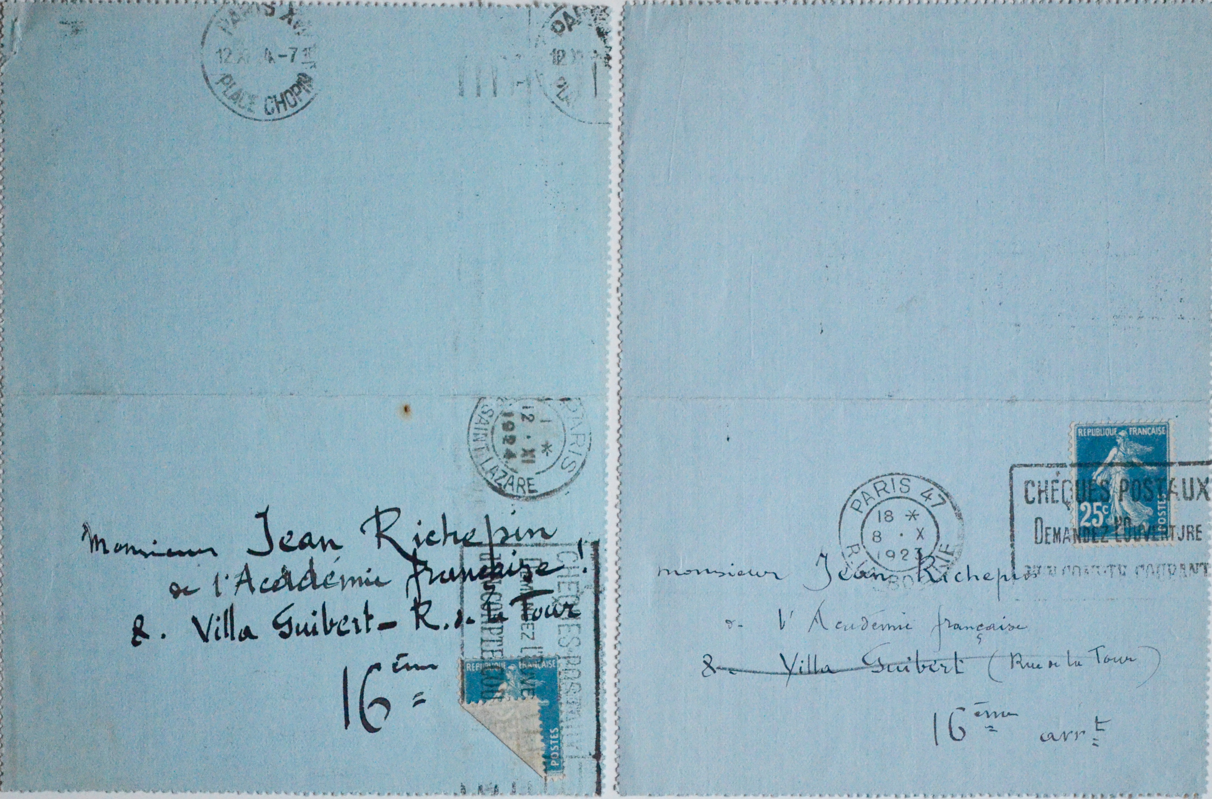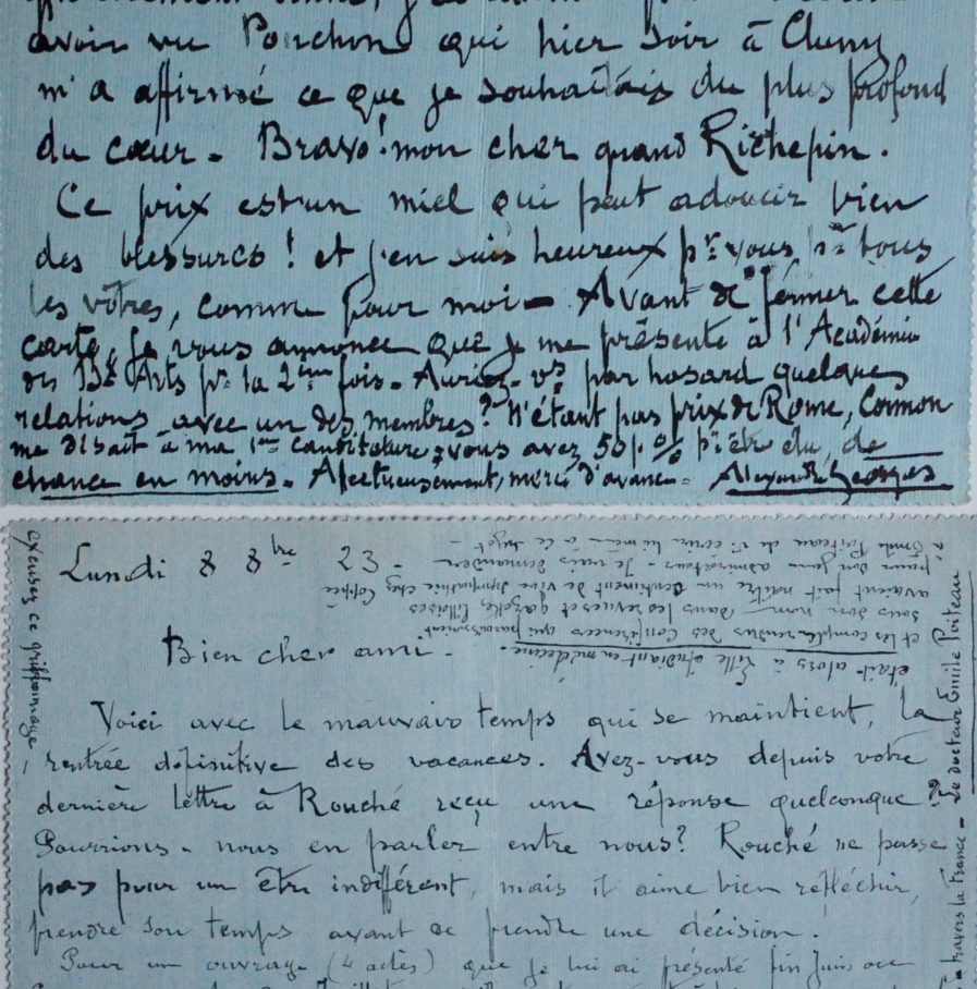 - 1923 : Au sujet du mécène, directeur de revues et homme d'affaires Jacques Rouché : "Avez-vous depuis votre dernière lettre à Rouché reçu une réponse quelconque ? Pourrions-nous en parler entre nous ? Rouché ne passe pas pour un être indifférent, mais il aime bien réfléchir, prendre son temps avant de prendre une décision". Il évoque un ouvrage en 4 actes jugé très bien par Rouché, mais très onéreux et poursuit : "C'est comme cela que j'ai porté sur Miarka [Opéra-Comique en 4 actes d'Alexandre Georges, puis réduit à 3 actes] toute ma pensée et le désir de la sortir des griffes des bandits qui voudraient l'étouffer complètement [...]". Il mentionne "une cantate à Lorette que j'ai dirigée il y a trois semaines sur la fameuse colline [...]" et attire l'attention de Richepin pour le prix Goncourt ou de l'Académie française sur l'un de ses collaborateurs, le médecin et écrivain Émile Poiteau. Ce dernier, proche de René Bazin, de François Coppée et de Jules Lemaître mérite un prix.