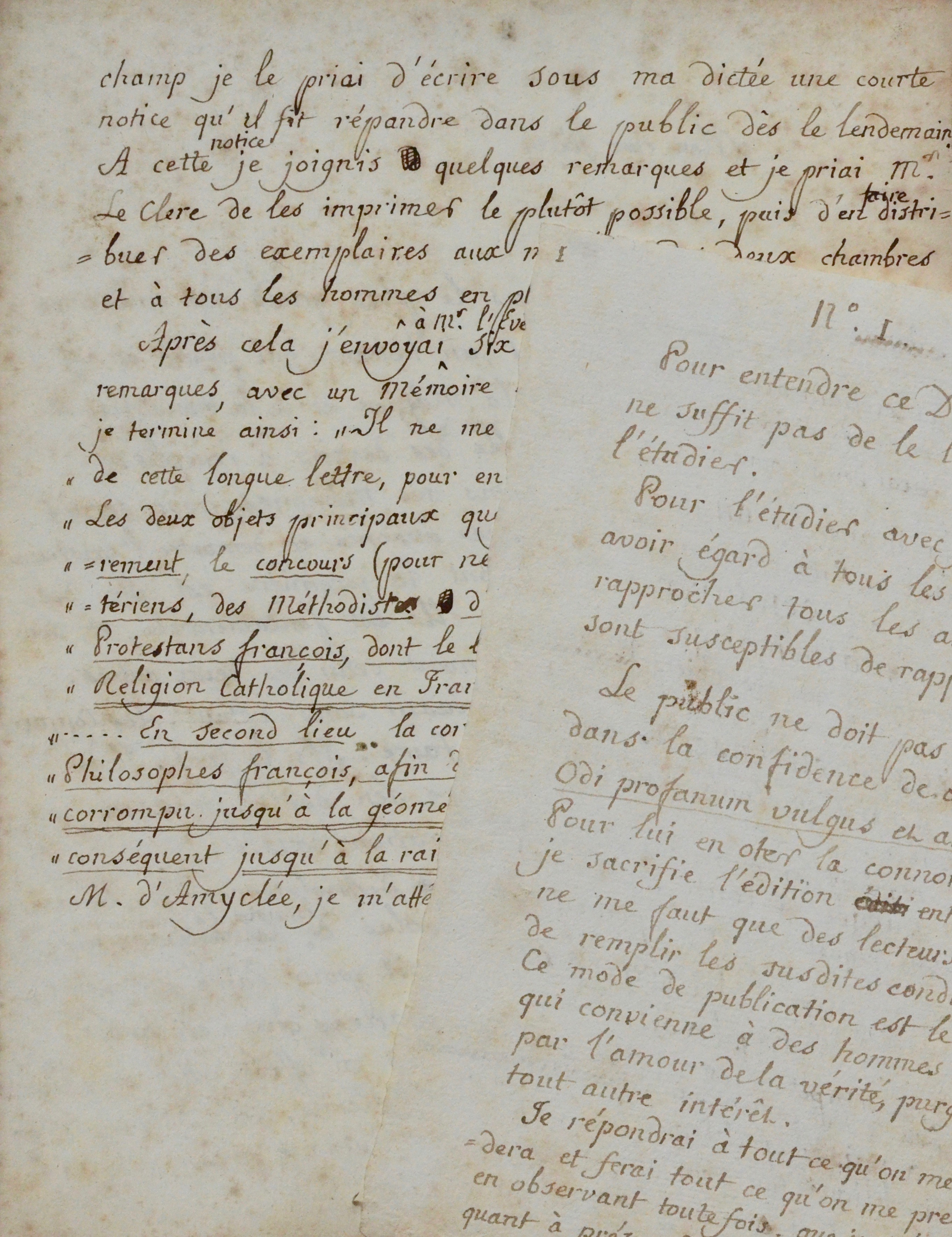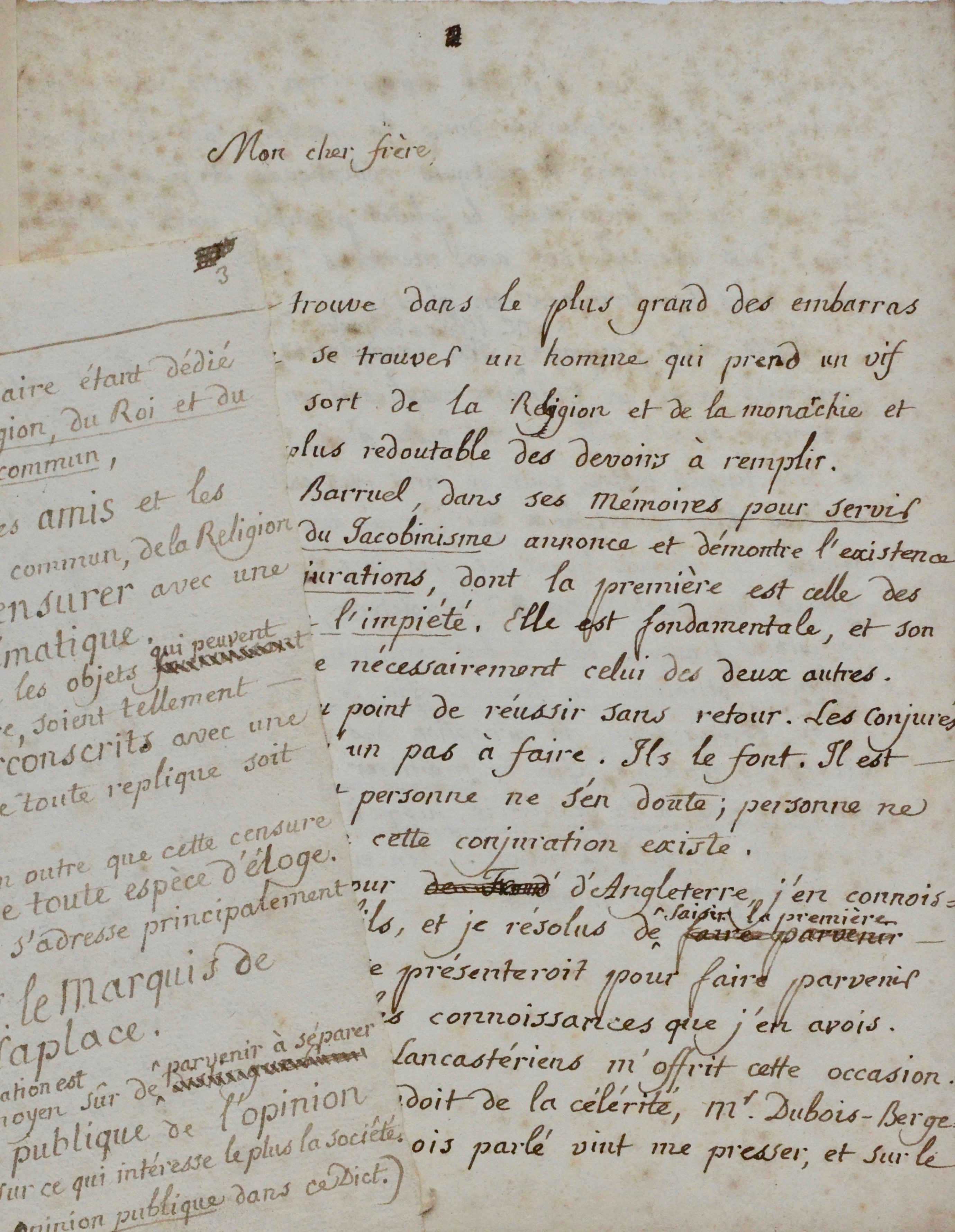 Manuscrit consacré à ce Dictionnaire, développé en 4 points, dénonçant Laplace : «n°1. Pour entendre ce Dictionnaire, il ne suffit pas de le lire, il faut l'étudier […]. Le public ne doit pas être mis dans la confidence de ce Dictionnaire. Pour lui en ôter la connoissance, je sacrifie l'édition entière. Il ne me faut que des lecteurs capables de remplir les susdites conditions. Ce mode de publication est le seul qui convienne à des hommes unis pas l'amour de la vérité, purgé de tout autre intérêt […]. N°3. Ce nouveau dictionnaire étant dédié aux amis de la Religion, du Roi et du sens commun, l'auteur invite les amis et les ennemis du sens commun, de la Religion et du Roi, à le censurer avec une rigueur mathématique. Il demande que les objets qui peuvent fournir matière à censure, soient tellement précisés, et circonscrits avec une telle netteté, que toute réplique soit impossible. Il requiert en outre que cette censure soit purgée de toute espèce d'éloge. Cette requête s'adresse principalement à Mr le marquis de Laplace […]. N°4. Avis. Mr le marquis de Laplace est le chef invisible de la conspiration des sophistes de l'impiété dénoncée en 1797 par l'abbé Barruel, dans ses mémoires pour servir à l'histoire du Jacobinisme, tome 1er. Cette conspiration est à la veille de réussir […]. C'est sur cet ensemble seul que Mr le Mis de Laplace devra se défendre […]».