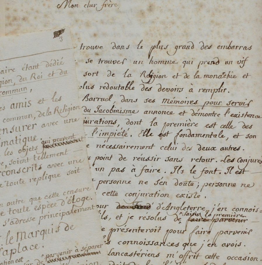 La lettre est dans le même ton : il explique ce qu'il fit à son retour d'Angleterre pour dévoiler la conjuration, en imprimant un texte qu'il fit répandre. Il mentionne l'abbé Barruel, Dubois-Bergeron, l'évêque d'Amyclée, etc.