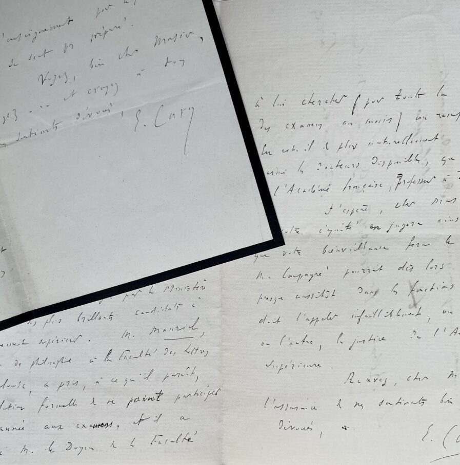 Deux lettres d’Elme Caro recommandant Emmanuel des Essarts et Gabriel Compayré