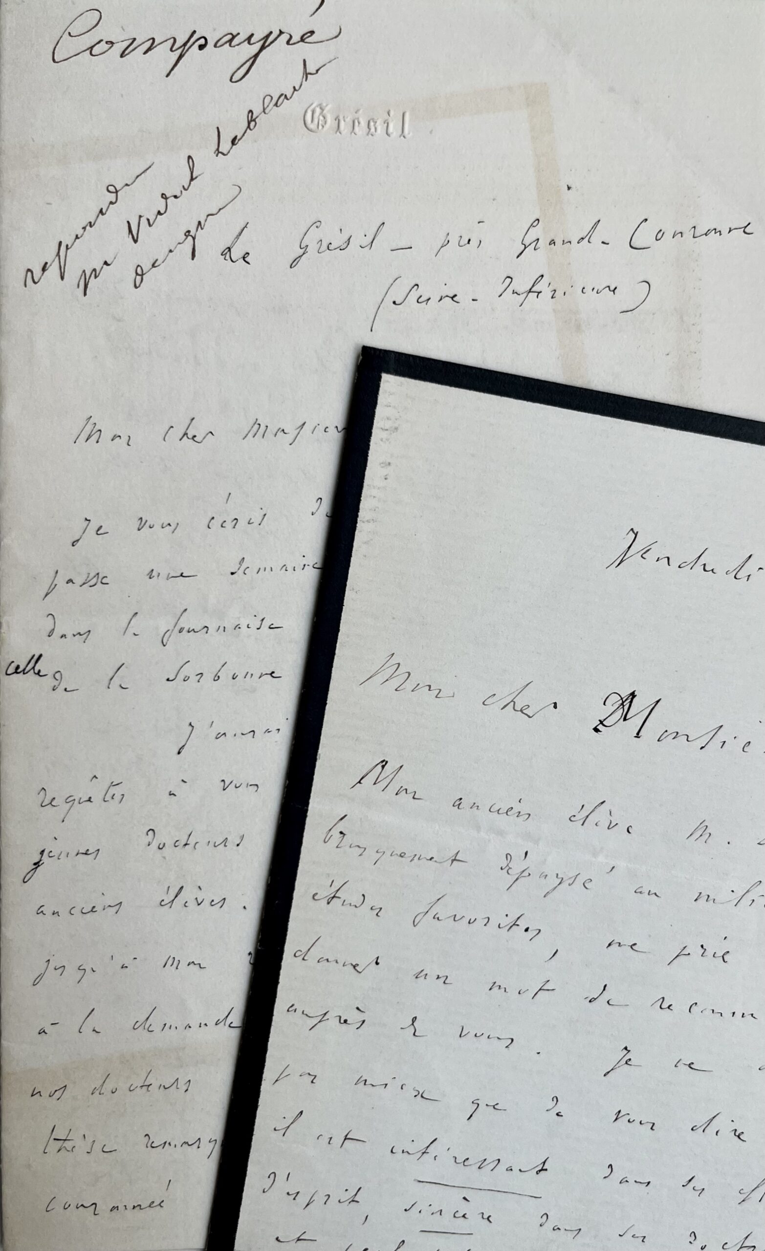 Un feuillet double de deuil et un en-tête "Grésil" gaufré.
