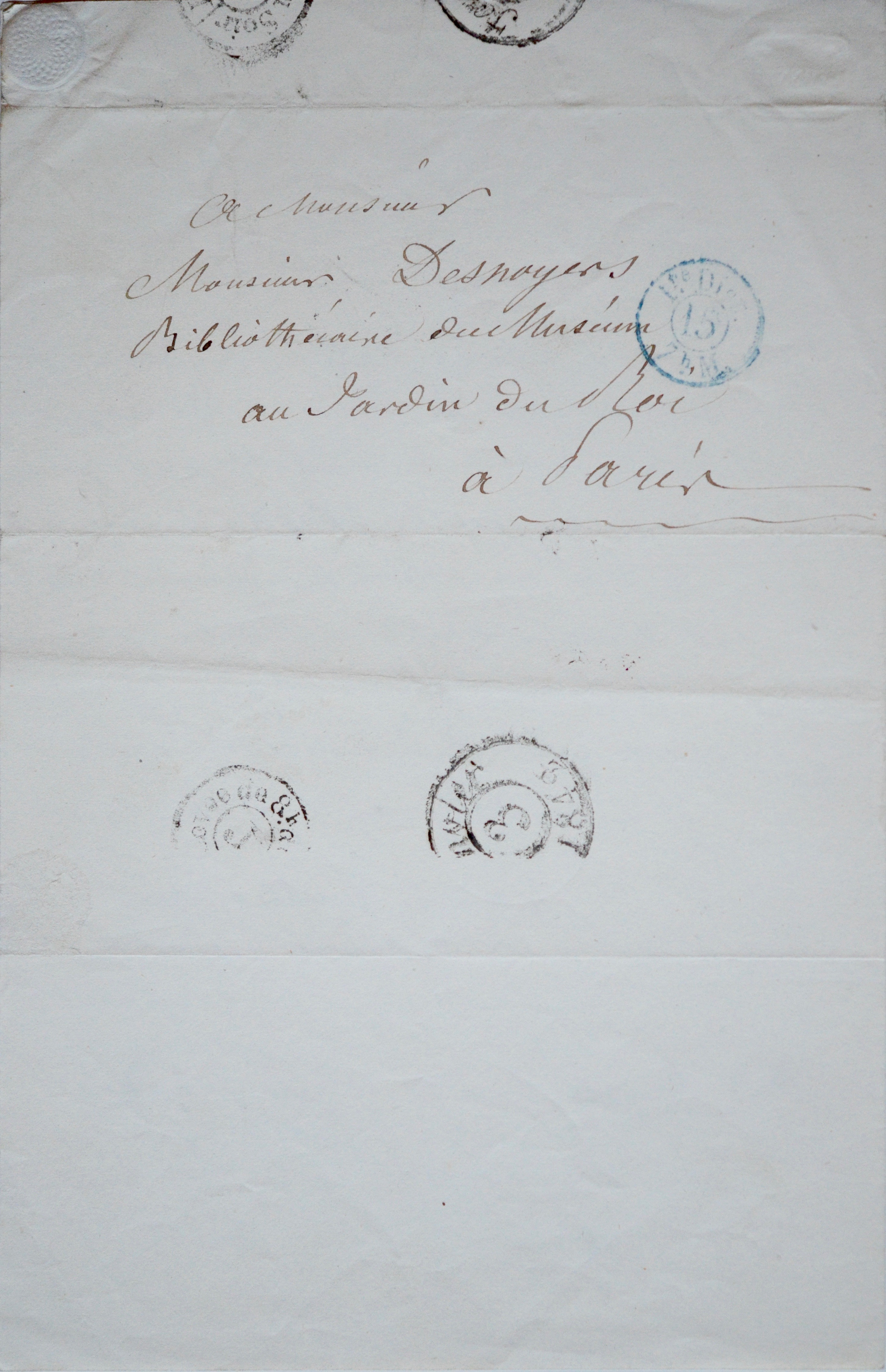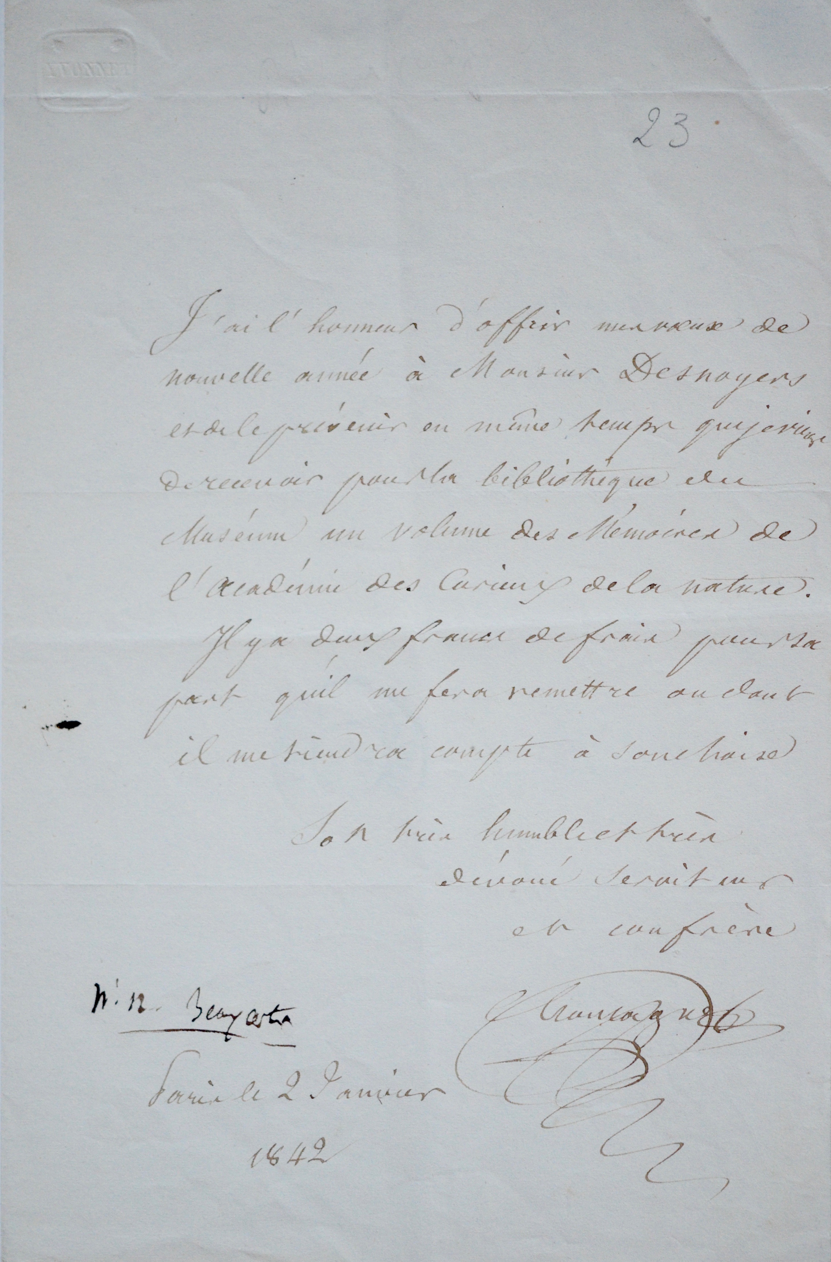 -Lettre adressée à Jules Desnoyers : "[...] je viens de recevoir pour la bibliothèque du Muséum un volume des Mémoires de l'Académie des Curieux de la Nature [...]".