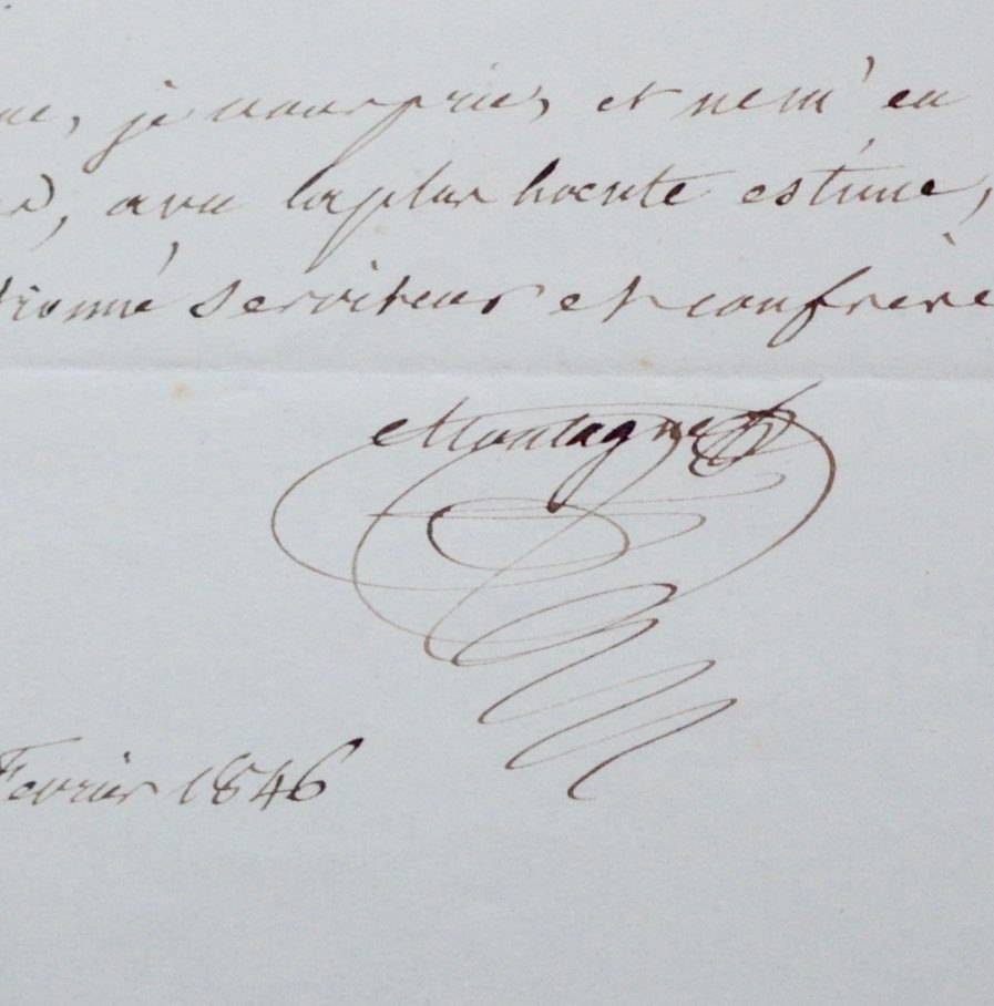 -Lettre adressée à l'entomologiste et zoologiste français Henri Milne-Edwards. "[...] Je suis extrêmement sensible à votre aimable invitation et j'aurais eu le plus grand plaisir à l'accepter,, si le même cause qui m'a empêché d'aller une autre fois à vos réunions du mercredi, n'était encore là pour y mettre son veto. En effet j'ai été retenu chez moi par une arthrite [...]". (16/02/1846).