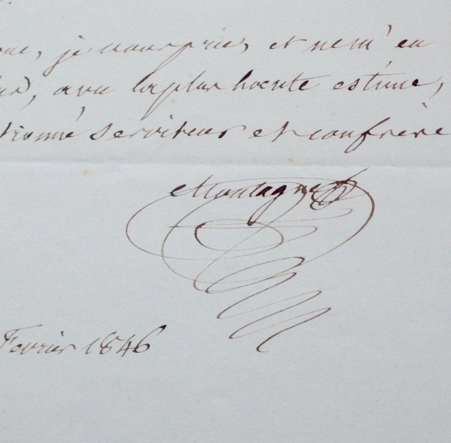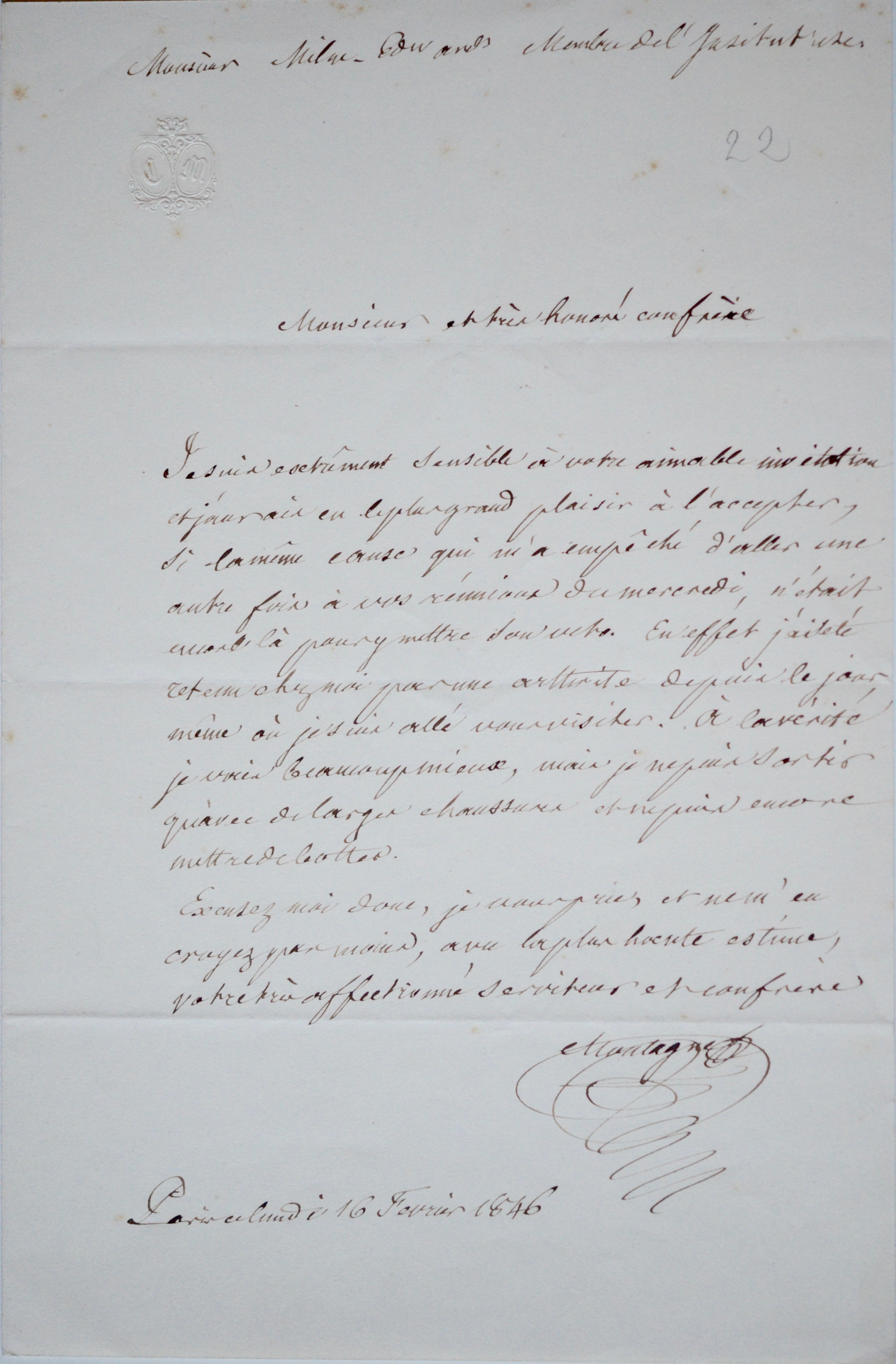 -Lettre adressée à l'entomologiste et zoologiste français Henri Milne-Edwards. "[...] Je suis extrêmement sensible à votre aimable invitation et j'aurais eu le plus grand plaisir à l'accepter,, si le même cause qui m'a empêché d'aller une autre fois à vos réunions du mercredi, n'était encore là pour y mettre son veto. En effet j'ai été retenu chez moi par une arthrite [...]". (16/02/1846).