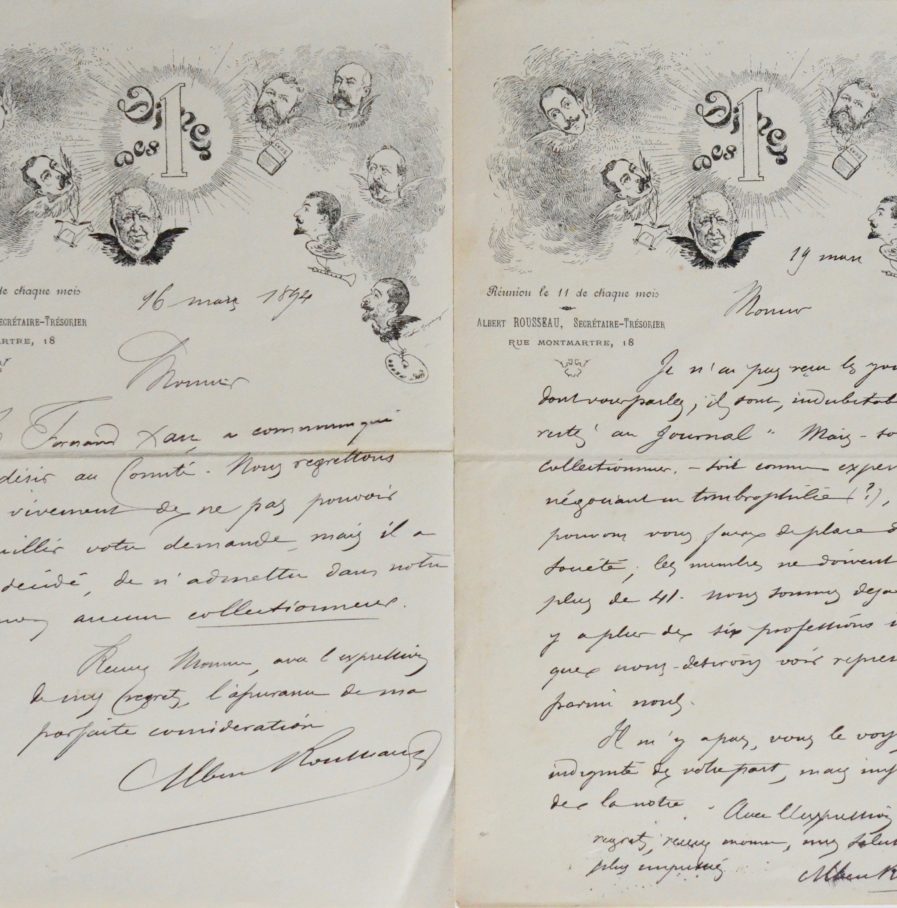 Deux lettres d'Albert Rousseau, secrétaire-trésorier d'une mystérieuse académie, "Dîner des 1", adressées à Pierre Mahé (1833-1913) un des premiers négociants en timbres-poste, fondateur de la revue le Timbrophile, qui postulait pour en faire partie.