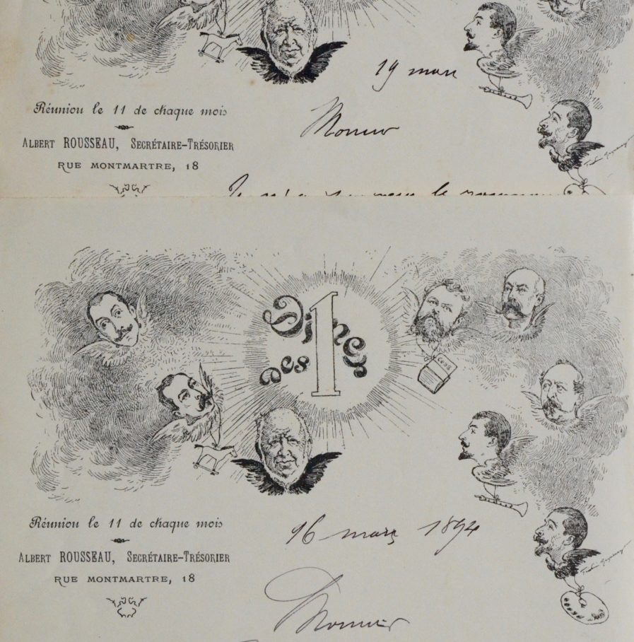 Beaux en-têtes gravés sur bois, par Frédéric Regamey, figurant des têtes hommes ailées avec l'attribut de leur métier : jouet, code, instrument de musique, palette de peintre (autoportrait de Régamey) et titre "Diner des 1", avec une mention qui précise : "Réunion le 11 de chaque mois".